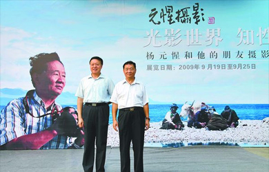 时任省委常委、副省长肖志恒(图左)莅临城市学院参观学院顾问杨元惺(图右)摄影展