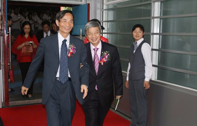 时任中央政府驻港联络办副主任、第十一届全国政协常委黎桂康(左一)在香港东莞同乡会会长王国强先生(左二)陪同下视察我院