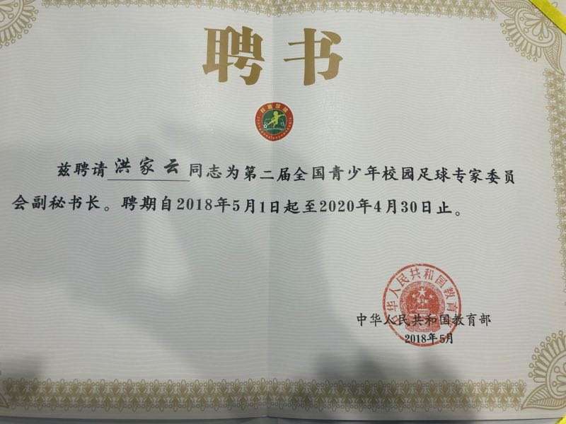 近日,教育部《关于公布第二届全国青少年校园足球专家委员会委员名单的通知》(教体艺函〔2018〕7号)公布了第二届全国青少年校园足球专家委员会组成名单,欧冠官网洪家云教授被特聘为专家委员,并担任本届委员会副秘书长。此次当选委员由中华人民共和国教育部颁发聘书,任期两年,自2018年5月1日至2020年4月30日止。