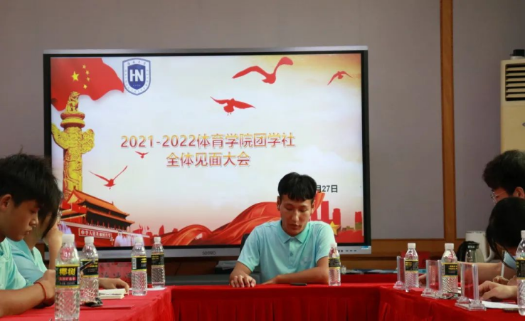 会议第一项,学工办主任许达谭致辞、颁发聘书。许谭达老师对卸任的团学成员表达了赞许,肯定他们在上学年为团学社工作付出的辛勤努力。同时对新加入的学生干事表示热烈欢迎,并提出了对团学社发展的要求与希望。许谭达老师提出今年是体院团学社成立第三年,团学社还处于发展阶段,需要每位团学社成员取长补短,发挥自己所学,为团学社发展尽心尽力。此外要求成员服从安排,尽职尽责,以全心全意为同学服务为宗旨。最后,鼓励全体新生干事大胆创新,敢于提出想法,善于自我批评,弥补不足之处,争取将各项团学社工作做得更加完美。
