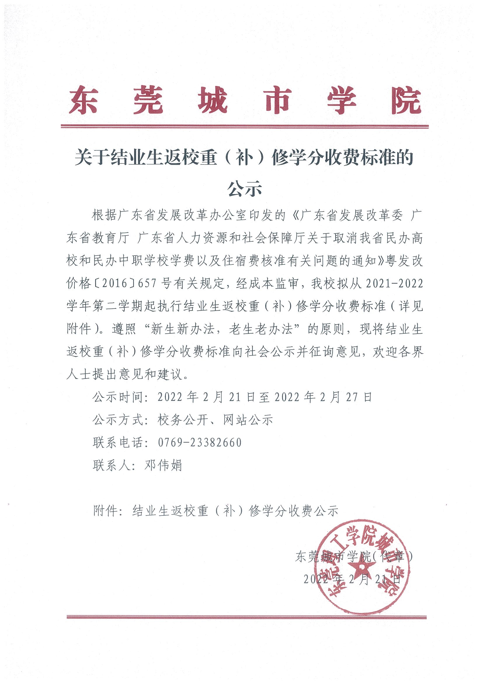 关于结业生返校重(补)修学分收费标准的公示