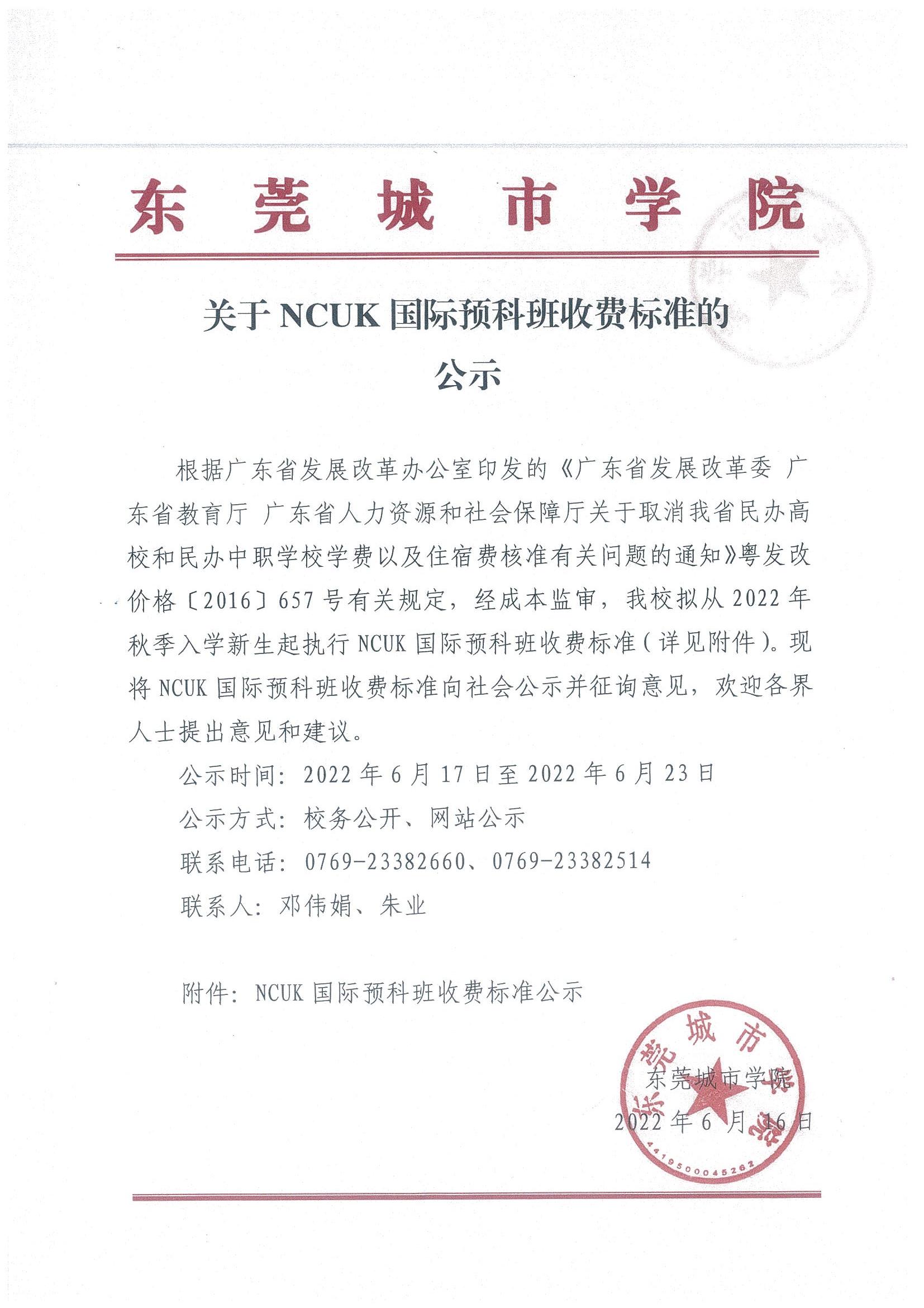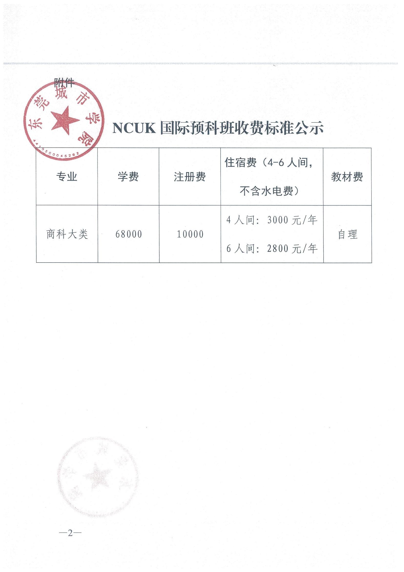 关于NCUK国际预科班收费标准的公示