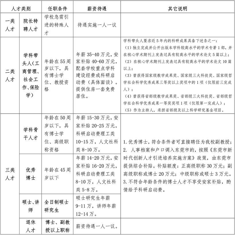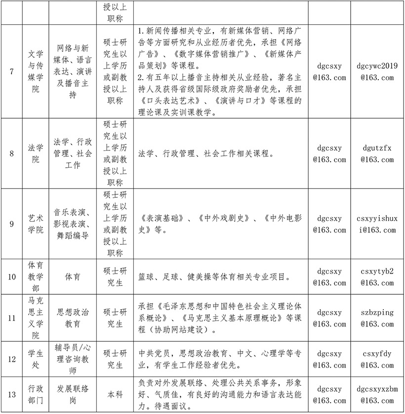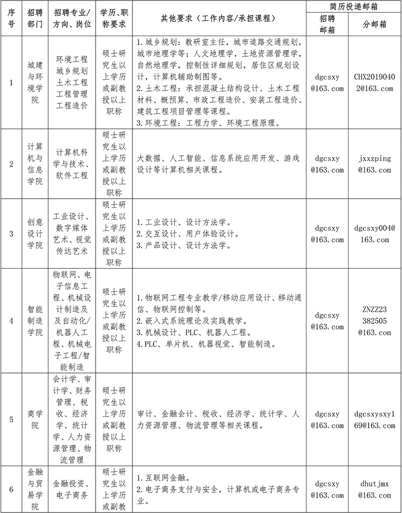备注:将应聘材料电子版同时发送至人事处招聘邮箱(dgcsxy@163.com)和各分邮箱(邮箱地址详见招聘岗位表),打包文件不大于50M,文件夹名称格式如下:姓名+专业+学历+职称+应聘岗位+获知招聘渠道。