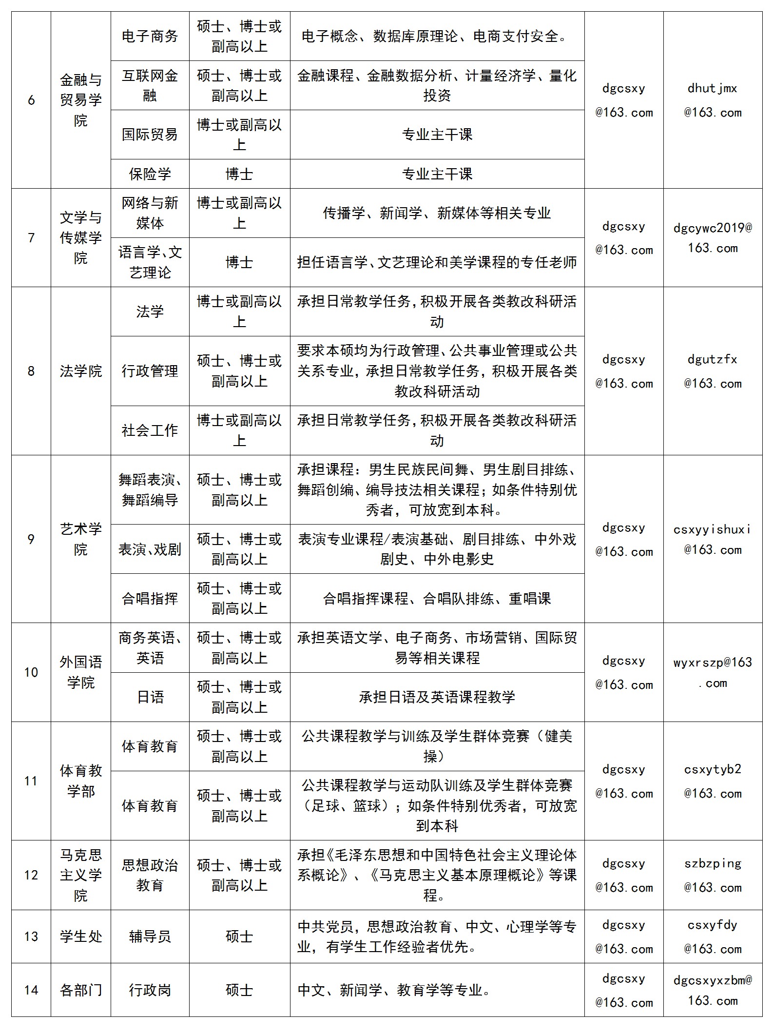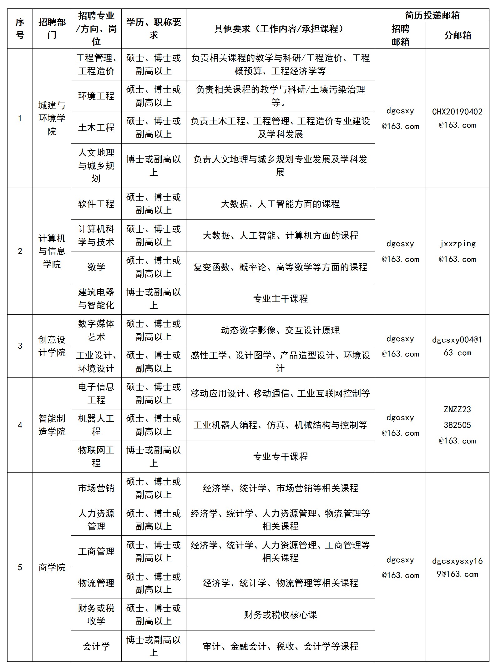 备注:将应聘材料电子版同时发送至人事处招聘邮箱(dgcsxy@163.com)和各分邮箱(邮箱地址详见招聘岗位表),打包文件不大于50M,文件夹名称格式如下:姓名+专业+学历+职称+应聘岗位+获知招聘渠道。