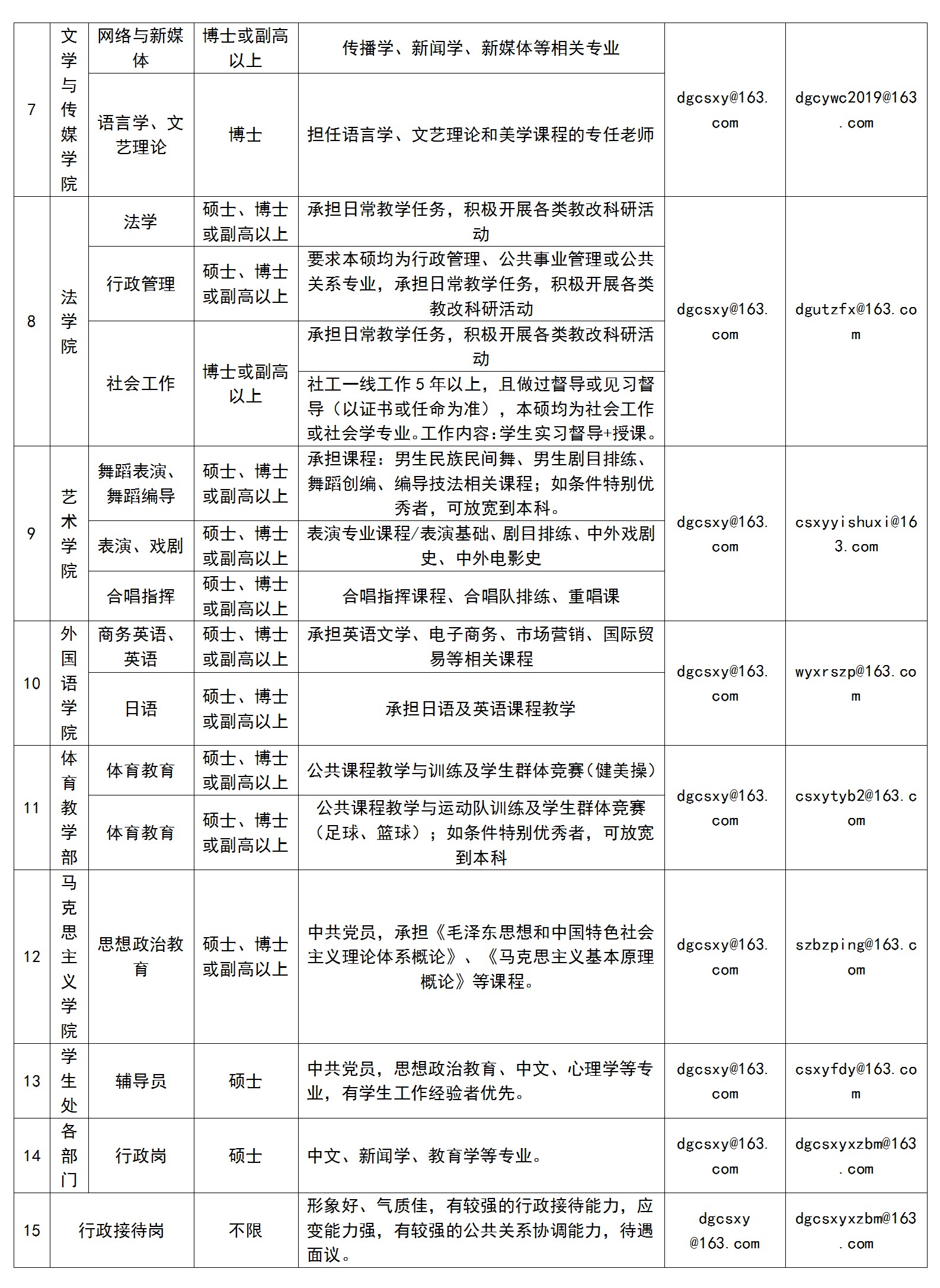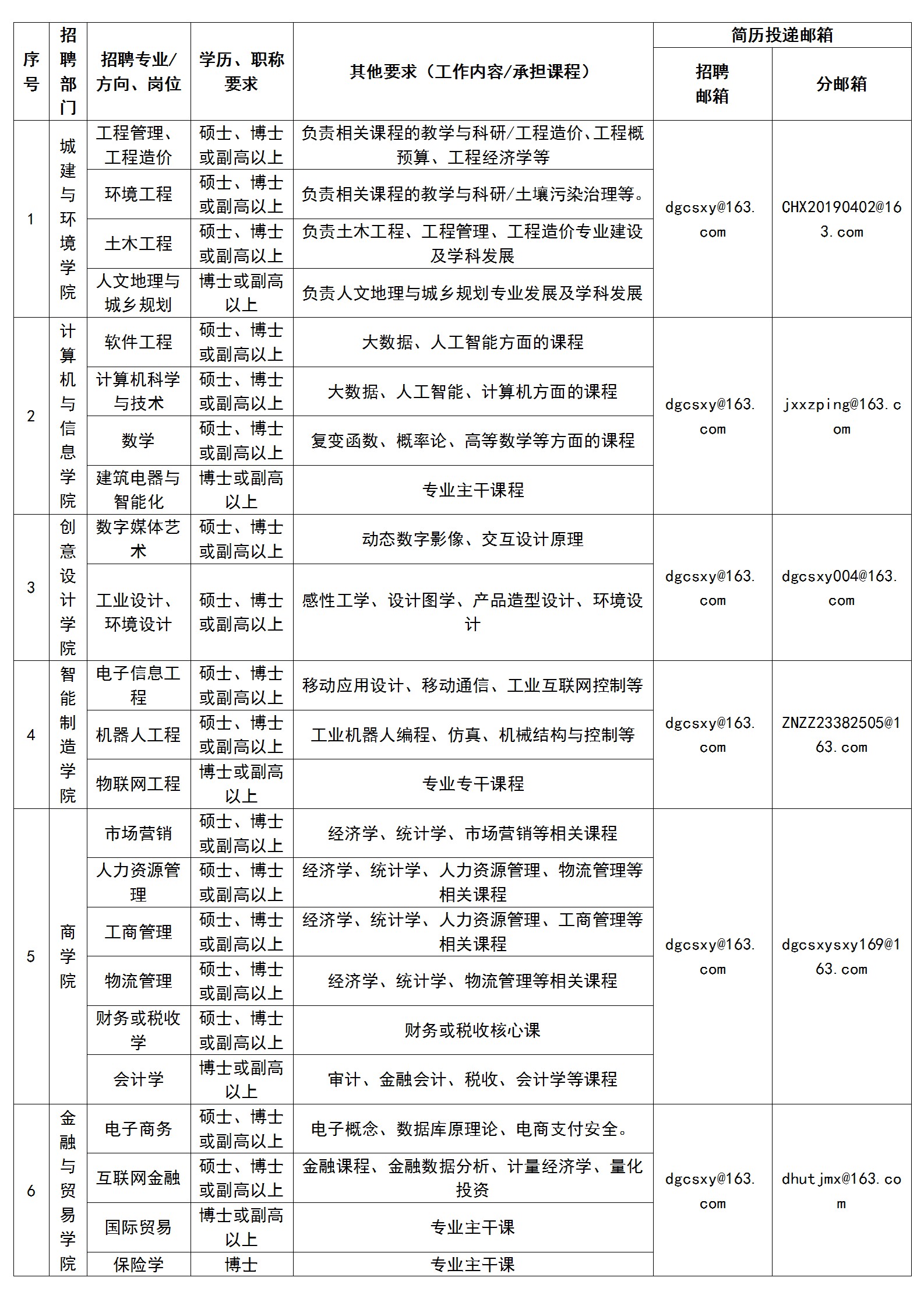 备注:将应聘材料电子版同时发送至人事处招聘邮箱(dgcsxy@163.com)和各分邮箱(邮箱地址详见招聘岗位表)打包文件不大于50M,文件夹名称格式如下:姓名+专业+学历+职称+应聘岗位+获知招聘渠道