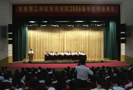 6月22日,院长、教授、博士、老师、系部负责人、学院机关干部、在校学生代表和毕业生相聚学院大礼堂,共叙离别情谊。东莞理工学院城市学院教学点2006届学生毕业典礼在这里隆重举行。 大会在庄严的国歌声中开始。 东莞理工学院