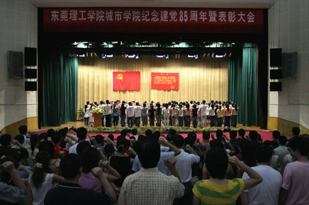 6月29日,东莞理工学院城市学院党委在学院大礼堂召开大会,隆重纪念中国共产党成立85周年,为132名新党员举行入党宣誓仪式,表彰2005—2006学年度先进基层党组织和优秀共产党员。 大会在庄严的国歌声中开始。会议举行别开生面