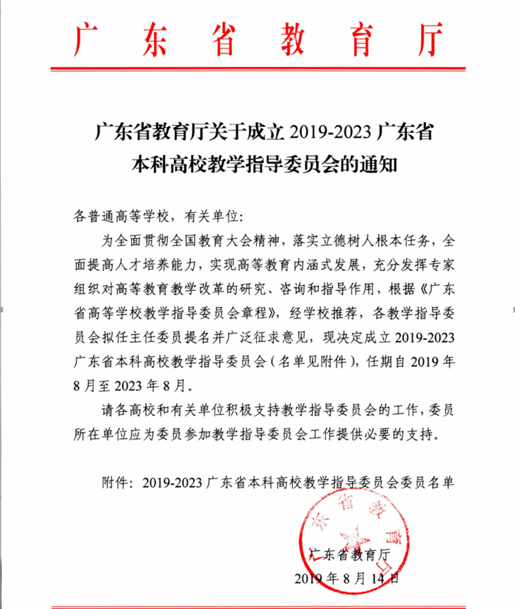 日前,广东省教育厅发布了成立2019-2023广东省本科高校教学指导委员会通知,beat365官网共有三位教授被省教育厅聘任为2019-2023年广东省本科高校教学指导委员会委员,他们是:赖忠孝教授被聘为“广东省本科高校经济与贸易类专业教学指导委员会委员”、宋秋敏教授被聘为“广东省本科高校中国语言文学类专业教学指导委员会委员”、张佺举教授被聘为“广东省本科高校物流管理与工程类专业教学指导委员会委员”。