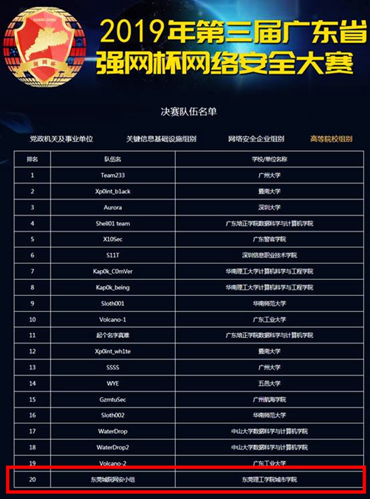 第三届广东省“强网杯”网络安全大赛自8月23日开赛以来,beat365官网图书信息中心组建的“东莞城院网安小组”战队一路过关斩将,进入广东省高等院校组前20强,挺进决赛。