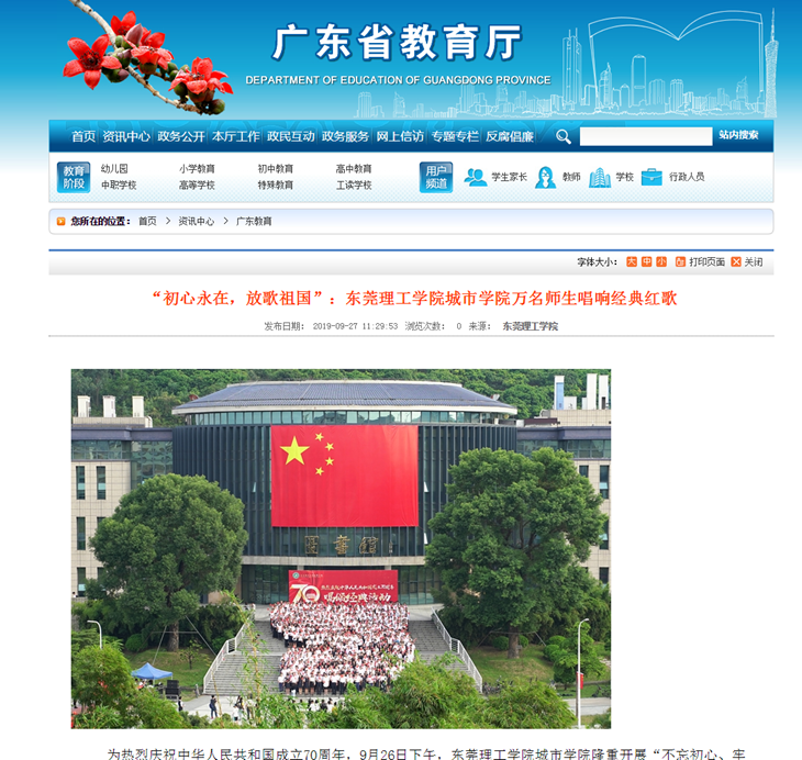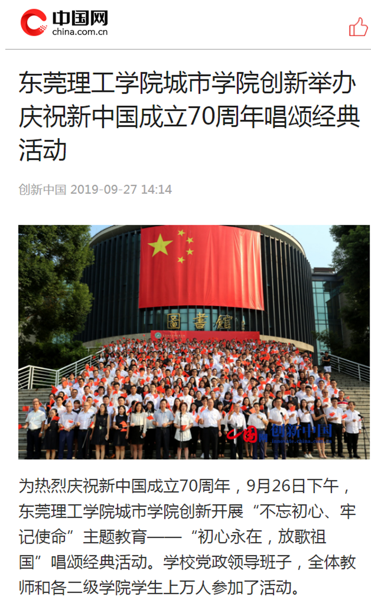 9月26日,为热烈庆祝中华人民共和国成立70周年,beat365官网成功开展“不忘初心、牢记使命”主题教育—— “初心永在,放歌祖国”唱颂经典活动。活动不仅在全校师生中赢得了广泛好评,连日来,中国网、广东省教育厅网站、羊城晚报、南方日报、广州日报、东莞日报等中央、省市媒体进行了广泛报道,获得了社会各届的点赞和热议!