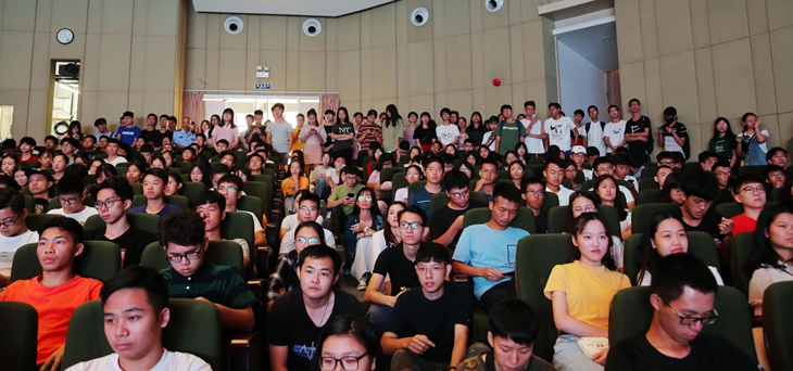 报告厅座无虚席,许多没有座位的学生坐在走道上,甚至站在会场边观看直播。每到激动人心的时刻,师生们都由心而发地响起阵阵热烈的掌声,为祖国欢呼喝彩
