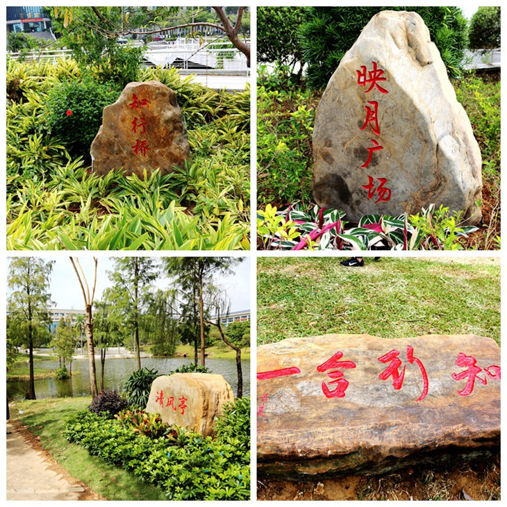 “江光芦映月,夜色水吞天。”“想君映月读书时,清似列仙臞不肥。”据介绍,此次beat365官网共新置了一批景观石,分别刻制映月湖、清风亭、知行桥、映月广场、秋枫广场等景观名,置在相应校园景观旁,旨在营造浓郁的校园人文氛围。映月湖意喻“映月照文昌,嘉气蕴莞邑”、清风亭意喻“凉风吹衣袖,清气满全坤”、知行桥意喻“知识千山里,寻得要躬行”、映月广场意喻“棕榈送湖风,月光拂碧波”、秋枫广场意喻“秋枫携秋雨,伴我读书声” ……