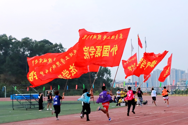 在励志的歌声中,同学们扛着印有各院名称的大旗冲进了跑道,迎着落日余晖的飒飒秋风,向前奔跑着。无数同学们注视着迎风招展的旗帜,仿佛看向梦的远方。