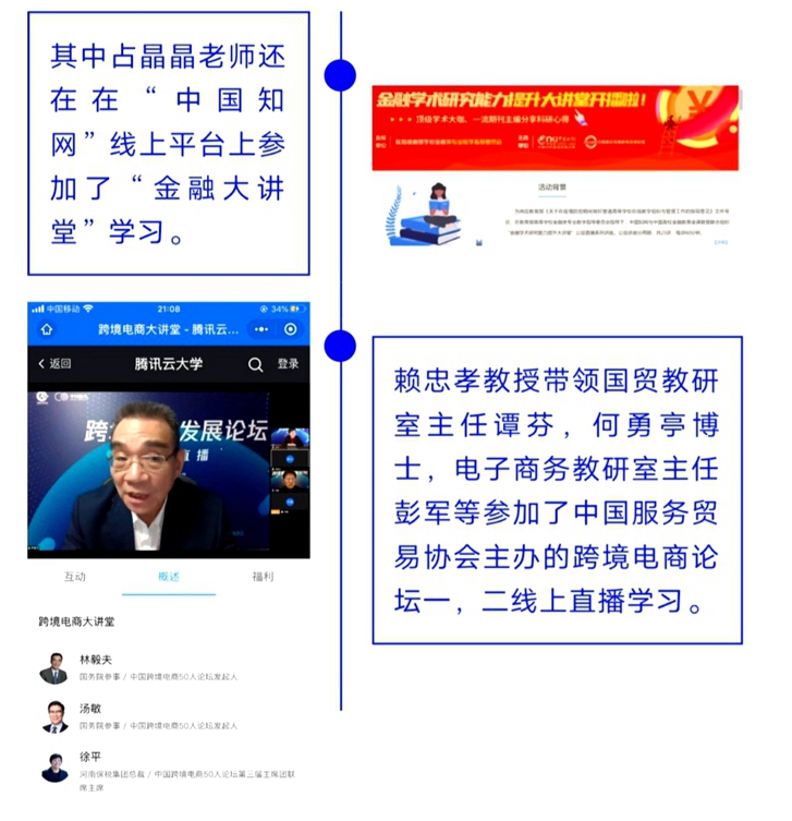 在疫情防控期间,金融与贸易学院根据学校的部署安排,全体教师积极探索,认真备课,保证全院线上教学活动顺利开展。与此同时,全院教师在院领导的带领下,由教研室主任带动老师在课余时间积极参加各类线上学习培训,努力提升自己,营造了浓郁的“停课不停教,停课不停学”学习氛围,在探索创建学习型组织的道路上更上一层楼。