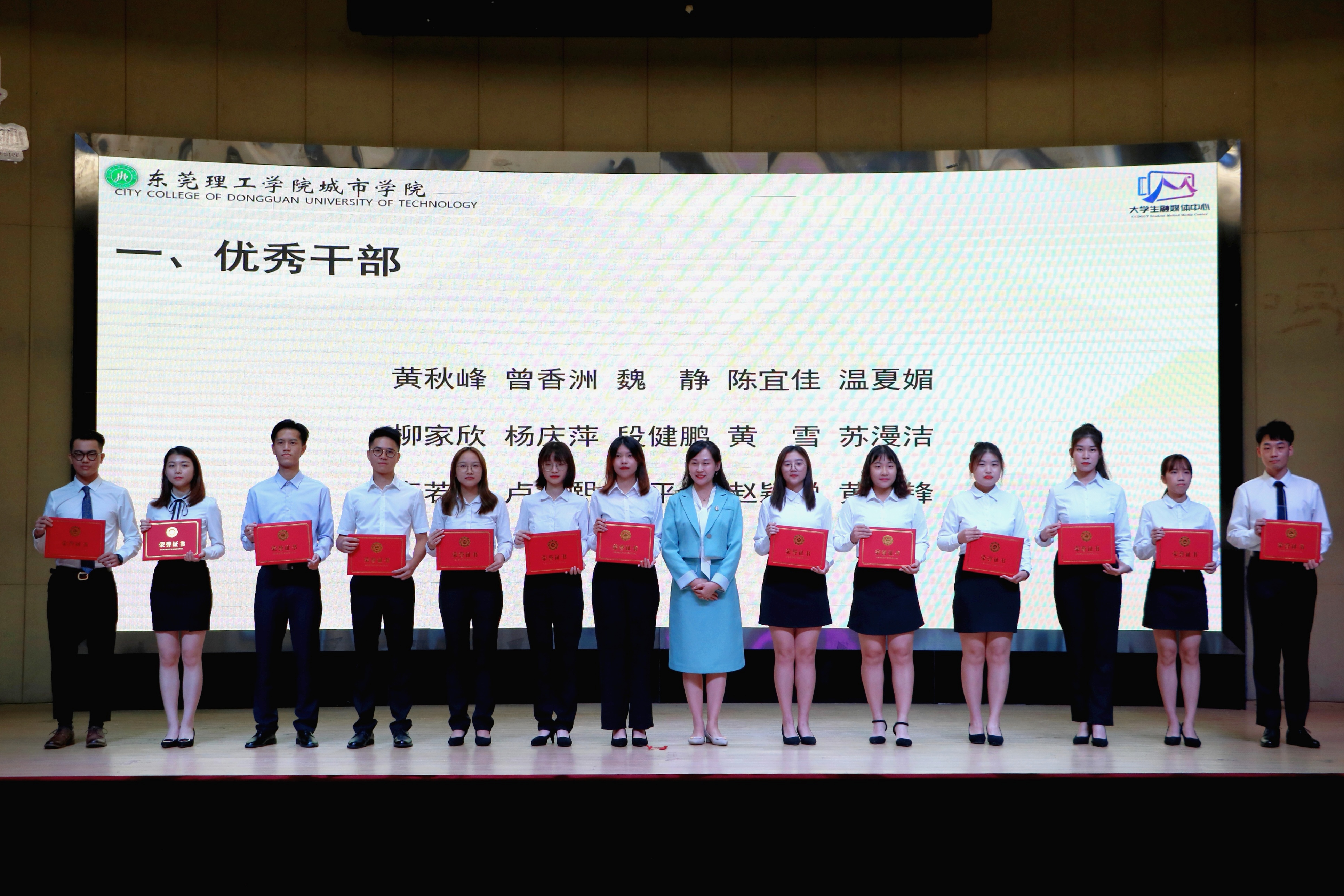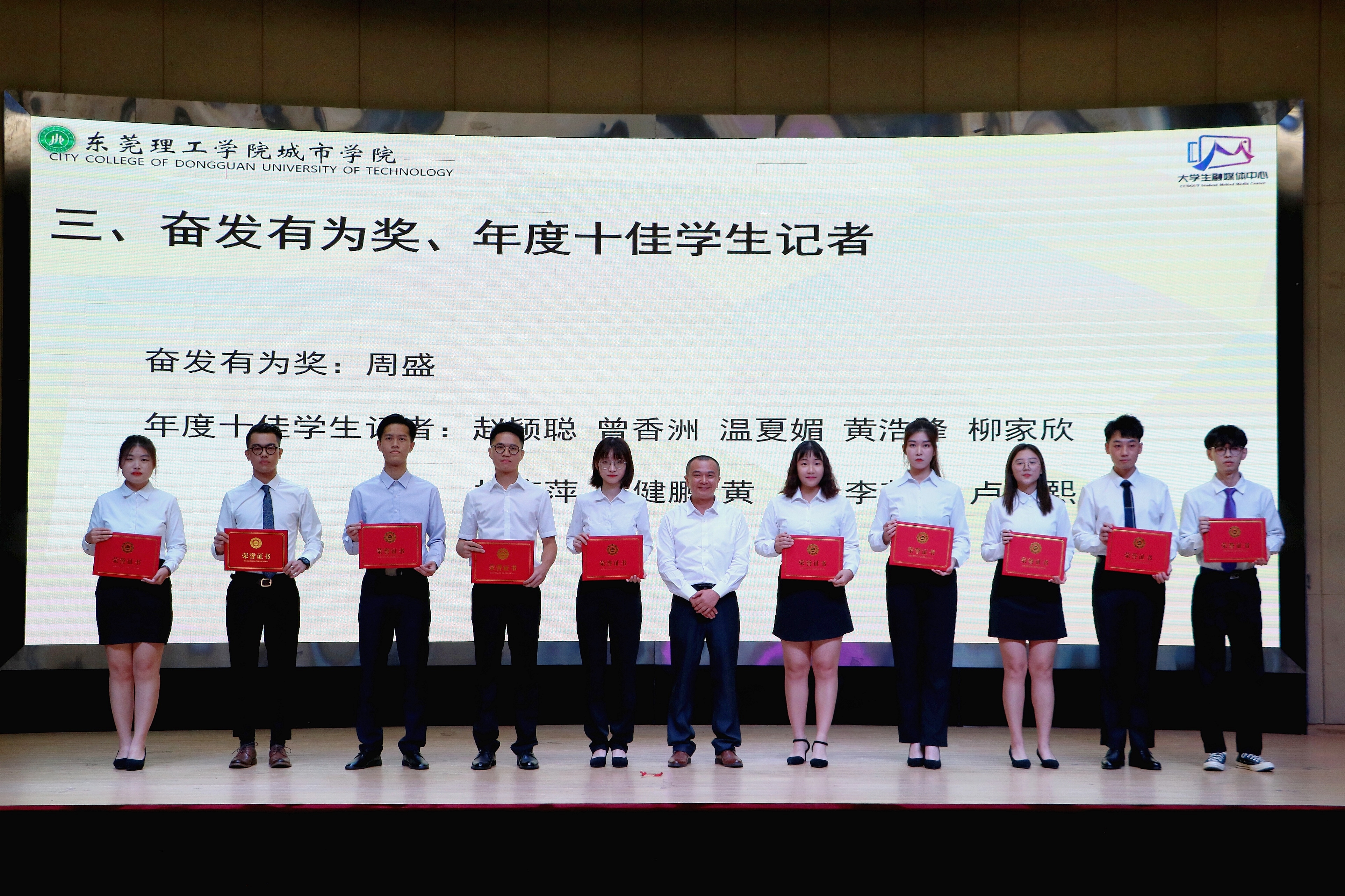 叶云峰副主任宣读《关于表彰2019-2020年度东莞理工学院城市学院第六届大学生融媒体中心优秀干部、优秀干事、奋发有为奖、年度十佳学生记者的决定》及《关于2020-2021年度东莞理工学院城市学院第七届大学生融媒体中心主任、副主任、各部(台)长的任命决定》。学校领导嘉宾分别为 “优秀干部”、“奋发有为奖”“年度十佳学生记者”“优秀干事”获得者颁发荣誉证书。