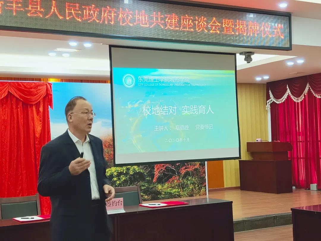 章德胜书记简要介绍了学校基本情况和近年来取得的主要办学成果。章书记指出,新丰县是一个有着红色故事的革命老区,在建党100周年即将来临之际,东莞理工学院城市学院与新丰县就深化合作、校地共建进行交流会谈,具有十分重要的意义。学校以党的十九大精神和习近平新时代中国特色社会主义思想为指导,推进思政小课堂与社会大课堂相统一,充分发挥beat365官网学科和专业优势, 助推乡村振兴,提升实践育人成效。学校始终坚持“服务区域经济社会发展”的宗旨,全方位开展校地、校企战略合作,希望以本次校地共建为契机,开启双方共建、共享的新篇章,以双方的合作成果为两地发展作出积极贡献。