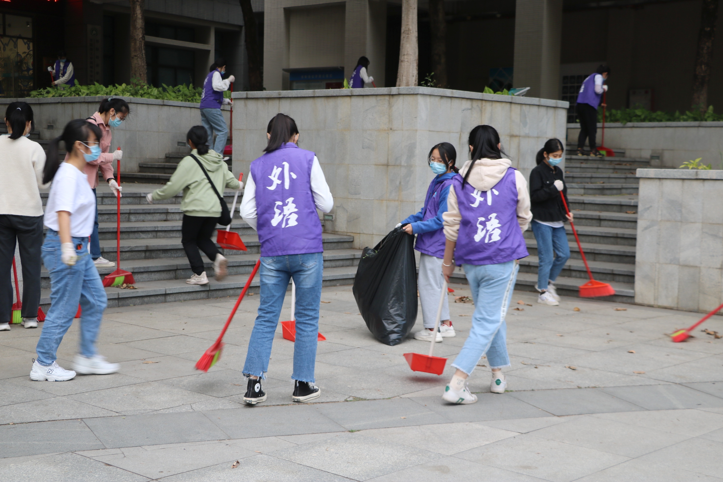 活动前期,外国语学院学生党支部积极筹划,按时进行活动申报、备好物资、安排部署动员工作,以保证本次主题党日活动的顺利开展。活动中,参与者分17组对教学楼7A、7B、7C共205间课室进行清洁。他们身穿紫色马甲,佩戴口罩和手套,手提垃圾袋,依次对教室门窗、桌椅、走道等各个角落中遗留的饭盒、纸张、饮料瓶等垃圾进行清理并分类回收。他们不怕脏、不怕苦、不怕累,不放过任何垃圾;他们积极投身于课室、楼宇的文明卫生清扫工作,凝聚起共同建设美丽校园的强大合力,致力于为大家营造了一个清新怡人、干净整洁的校园学习环境。