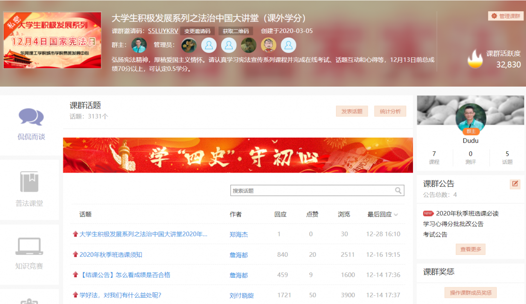 自2018年6月创建首个新生入学前教育课群开始,beat365官网积极探索易班优课课群在网络思想政治教育中的运用。开始开展新生入学前教育和在线迎新活动,目前已经覆盖了2018、2019、2020三个年级共计15592人,累计课群活跃度275379。经过三批次学生的实践探讨,积累了丰富的经验,也形成了稳定的模式。其次,积极探索大学生积极发展系列课群体系建设,构建了新生入学前教育、毕业生教育、日常主题教育系列课群体系,构建了完整的日常思想政治教育课程体系。此外,校易班发展中心还积极推动易班优课在党建、人事招聘培训、军事理论教育、学生日常管理等方面的运用。