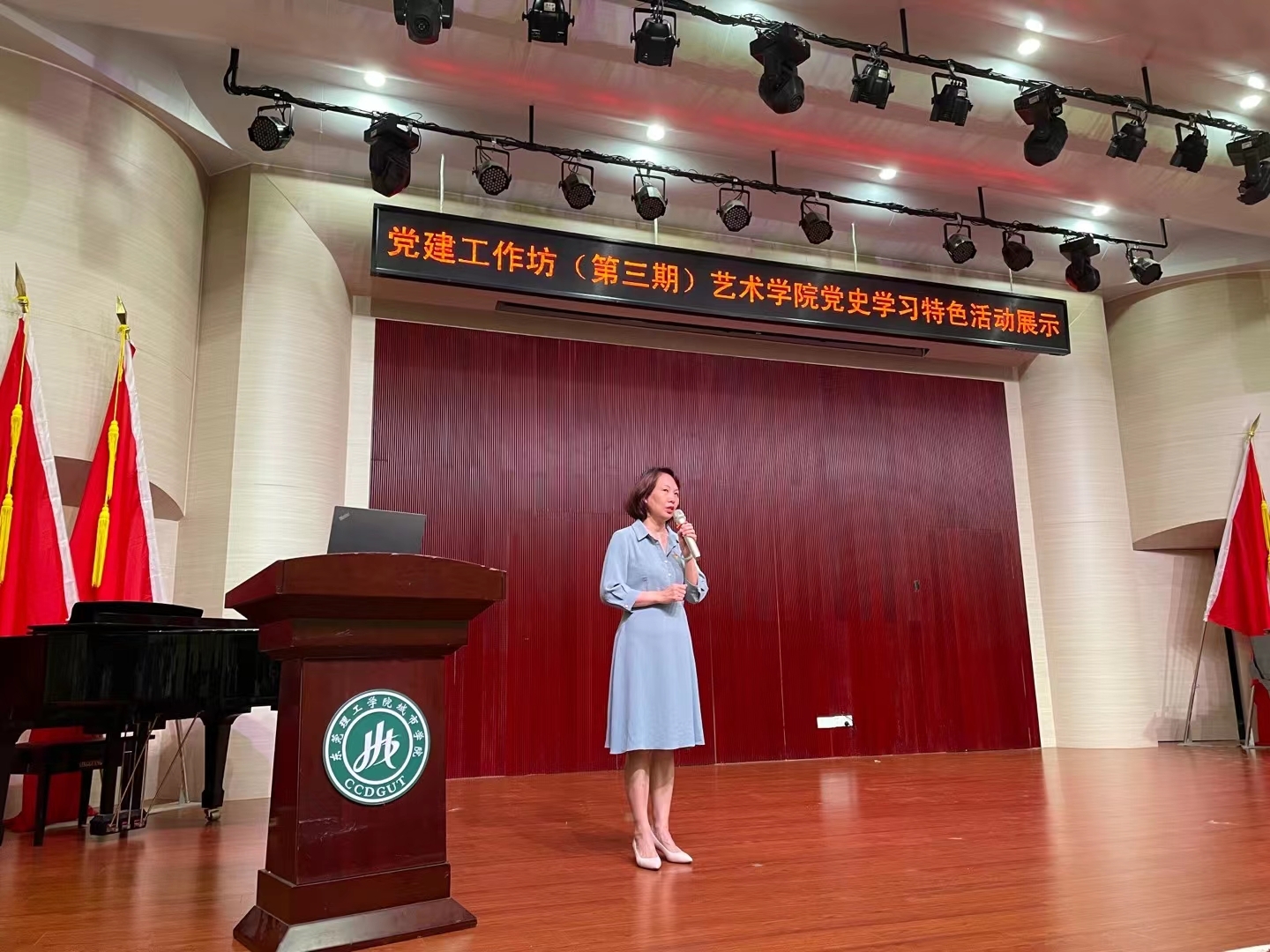 会上,艺术学院党总支书记康慧丽作特色党史学习活动汇报,介绍了艺术学院党总支概况和党史学习活动开展情况,同时就艺术学院如何结合自身艺术专业特色来开展党史学习教育进行了经验分享。康书记指出,艺术学院不断探索着将政治引领、社会服务与专业学习实现有机融合的党建新路子,红色文艺作品这种喜闻乐见的艺术形式,能够让师生和社会群众深刻感受中国共产党波澜壮阔的奋斗历程,是艺术学院学习和感悟党史的一种创新方式。