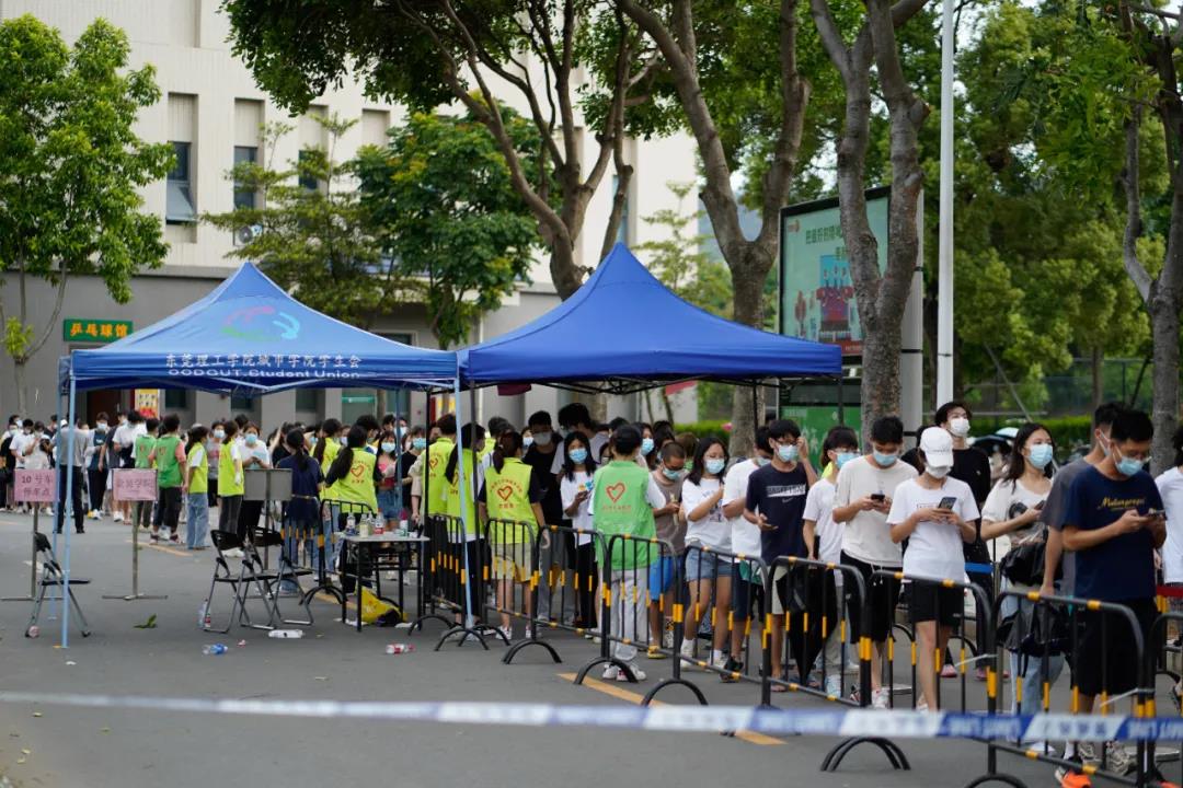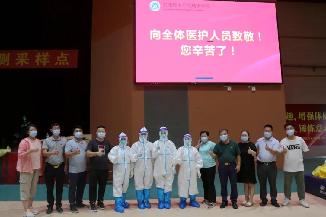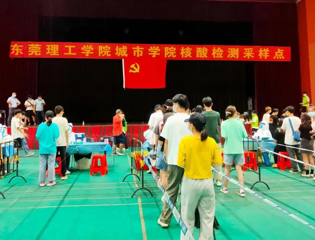 为做好新冠肺炎疫情防控工作,切实保障师生生命安全和身体健康,织密织牢防控安全网,6月21日,学校按照东莞市的统一部署在综合馆内开展对师生员工、住校家属的免费核酸检测。52名清远市妇幼保健医院和东莞市寮步疾控中心医护人员,170名学生志愿者与党员志愿者,以及后勤保障人员、行政管理人员,连续奋战4小时,完成14000份核酸检测,让所有人再次见证了城院的速度。