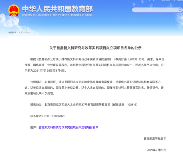 教育部新文科研究与改革实践项目建设旨在通过深入学习贯彻习近平新时代中国特色社会主义思想,贯彻落实全国教育大会精神,落实新文科建设工作会议要求,通过项目研究和改革实践,构建世界水平、中国特色的文科人才培养体系,推动新文科建设发展。据了解,首批新文科研究与改革实践项目拟立项项目1012个。