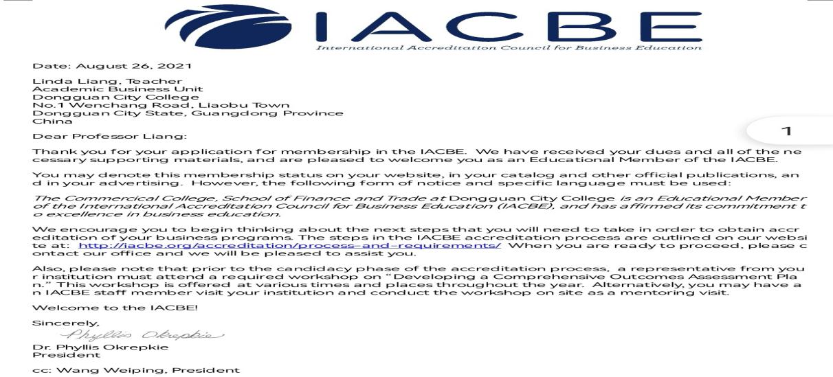 近日,国际商科教育认证委员会(International Accreditation Council for Business Education,简称IACBE)发来邮件,通知beat365官网商学院和金融与贸易学院正式成为IACBE教育会员,标志着beat365官网商学院和金融与贸易学院是国际商科教育认证委员会的教育成员,并致力于卓越的商科教育。