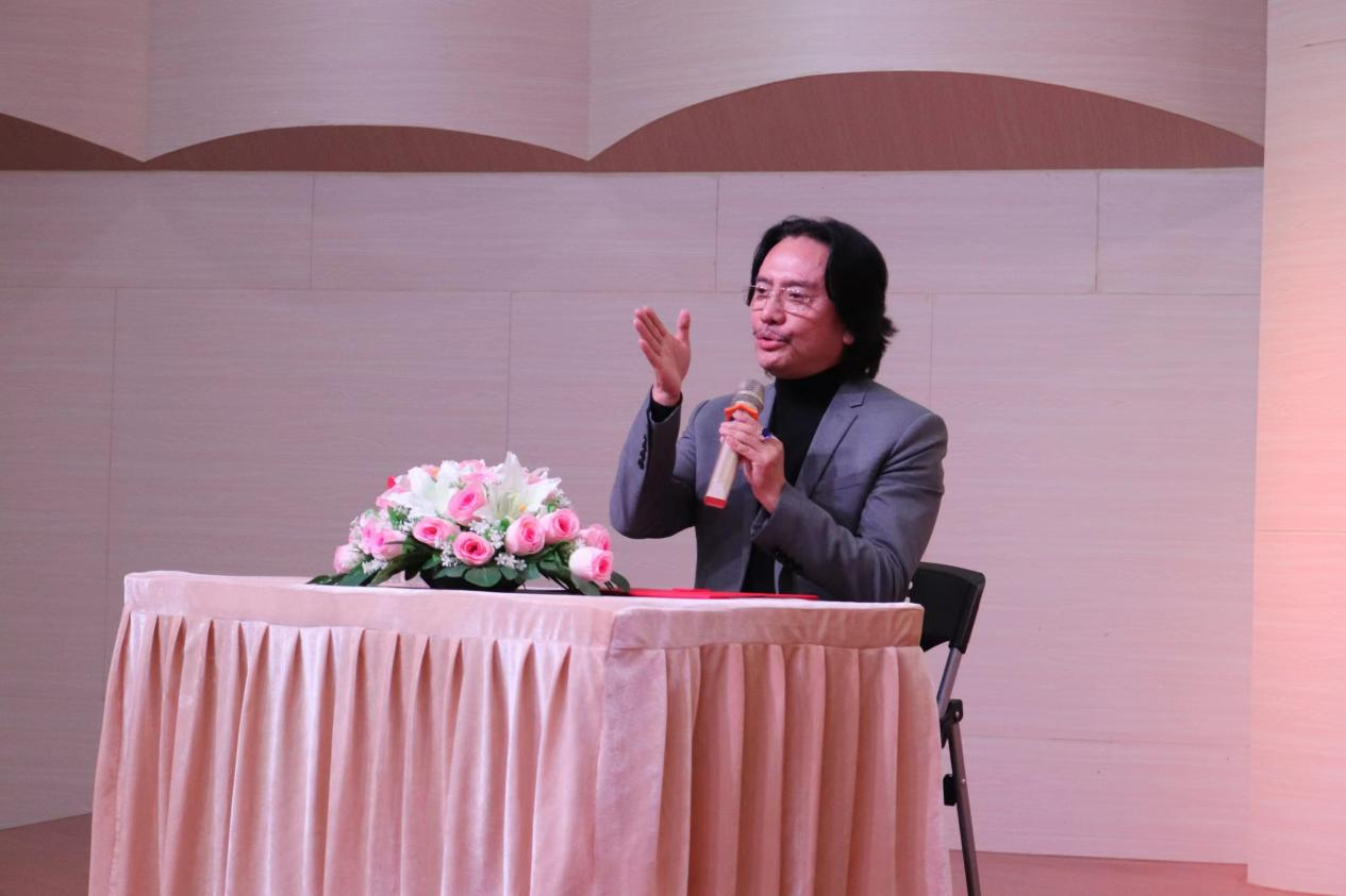 11月18日下午,我国著名音乐剧制作人、何李活音乐剧董事长李盾教授在beat365官网音乐厅做题为《人生第一步就走对》的讲座。东莞市政协副主席蒋小莺、李盾教授助理任书鑫、副校长麦绮琳及何李活音乐剧制作部成员刘亦凡等出席了讲座。讲座由艺术学院院长张征主持。