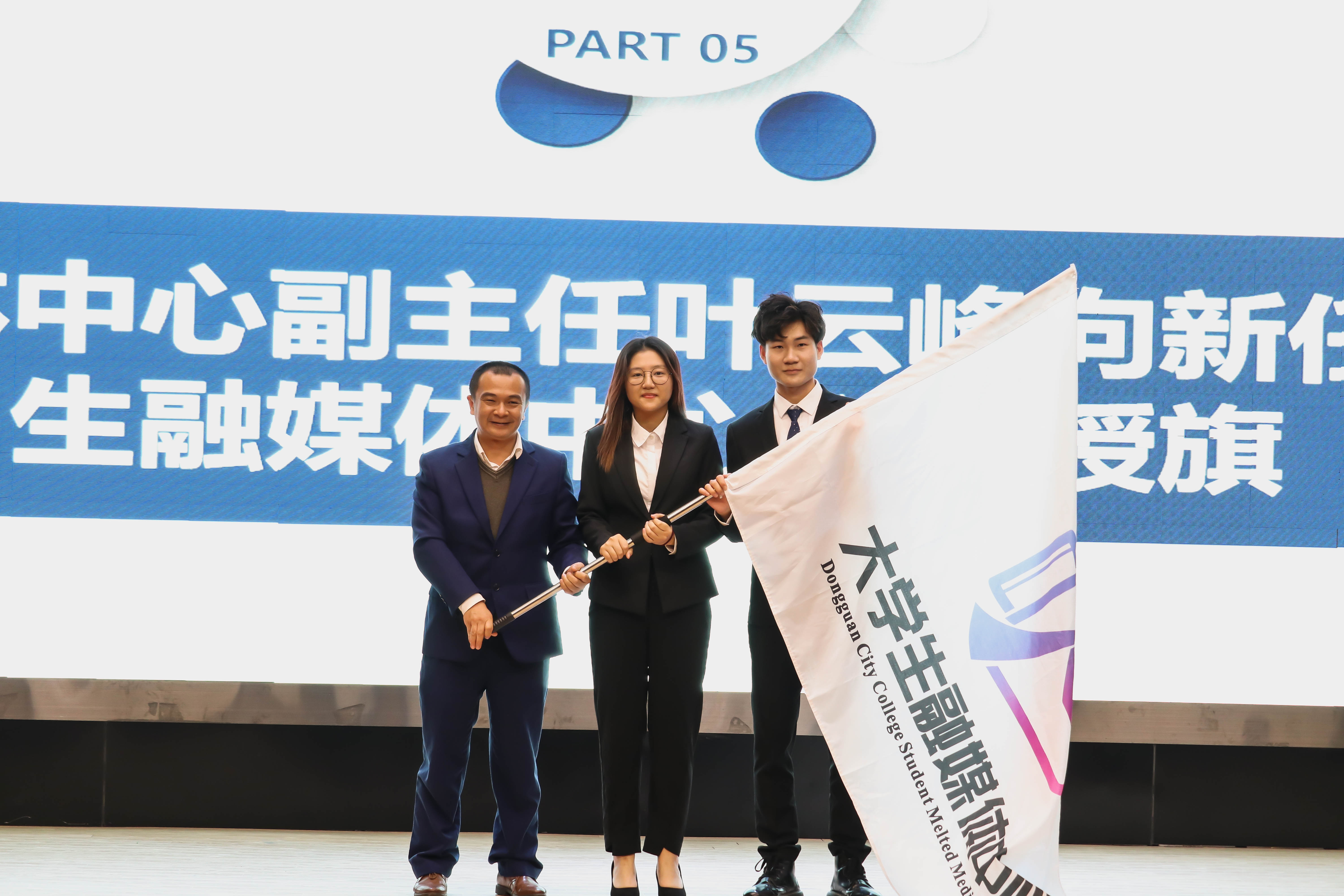 叶云峰向第八届大学生融媒体中心主任吴锦鹏授旗 。