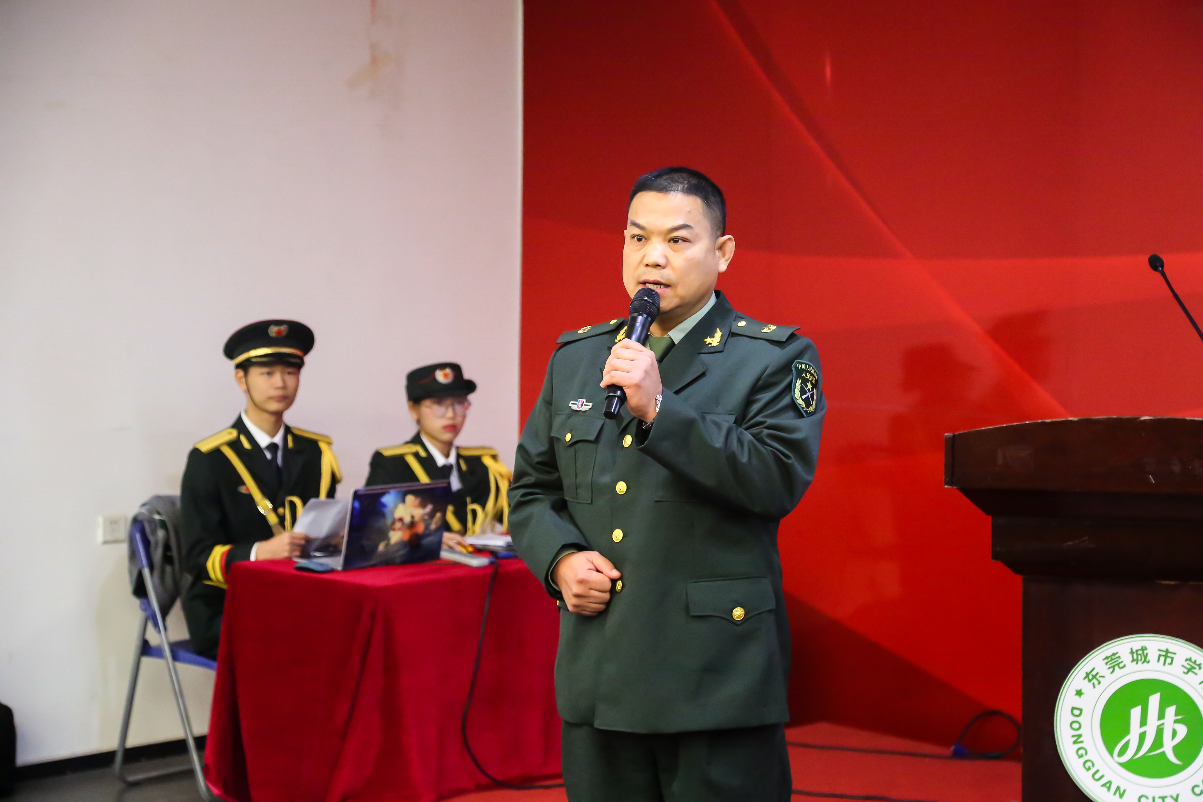 党委书记章德胜作了讲话。他指出国旗护卫队自成立以来,始终以护卫国旗为使命,以弘扬爱国主义精神为己任,以爱国、爱校、团结进取、积极向上的精神风貌为目标,展现当代大学生在校的一面校园文化旗帜。连续两年参加广东省学校国防教育成果交流展示及国旗护卫队比赛都获得“一等奖”好成绩。他对国旗护卫队提出三点希望:一是要“爱国旗,坚信念”。新一届的队员,应该珍惜每一次训练的机会,珍惜每一次升国旗的机会。永葆对国旗崇高的敬意;二是要“立大志,做大事”。作为中国新时代青年,除了完成护卫国旗的任务之外,更需立下远大志向,有抱负有担当;三是要“续传承,勇开拓”; 新队员不仅要传承国护精神,更要身体力行地弘扬红色文化。带动全体学生一起学,从学习中感悟共产党人的初心,从学习中汲取茁壮成长的精神力量。他希望各位队员能怀揣最初的热情,秉承国旗护卫队的队训“传承 责任 奉献 团结 ”,叫响国旗队的口号“一日护卫国旗,终身无上荣光”,在这大好青春中不断进取,绽放出自己最耀眼的青春光彩!