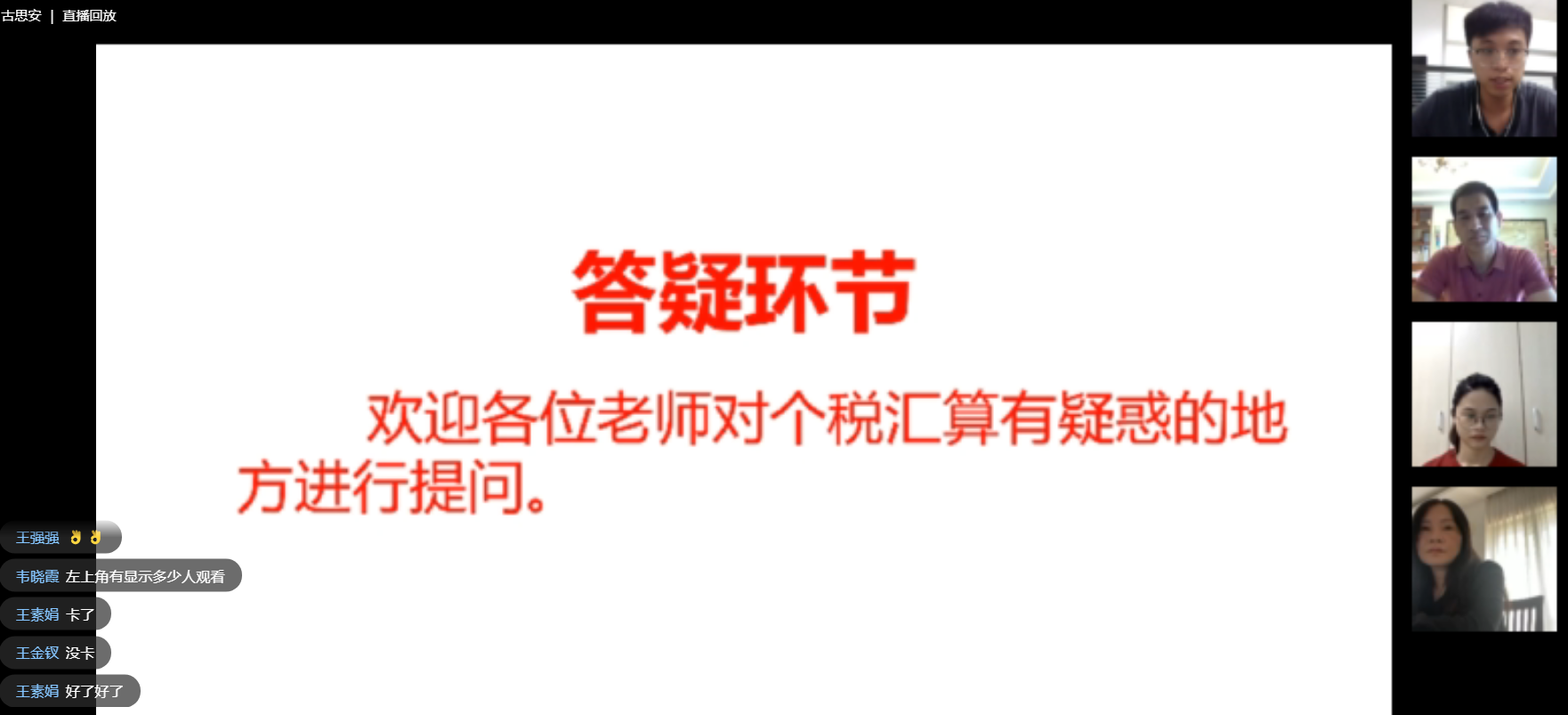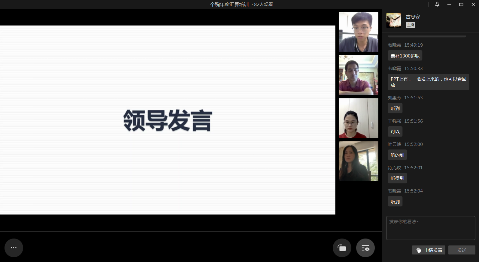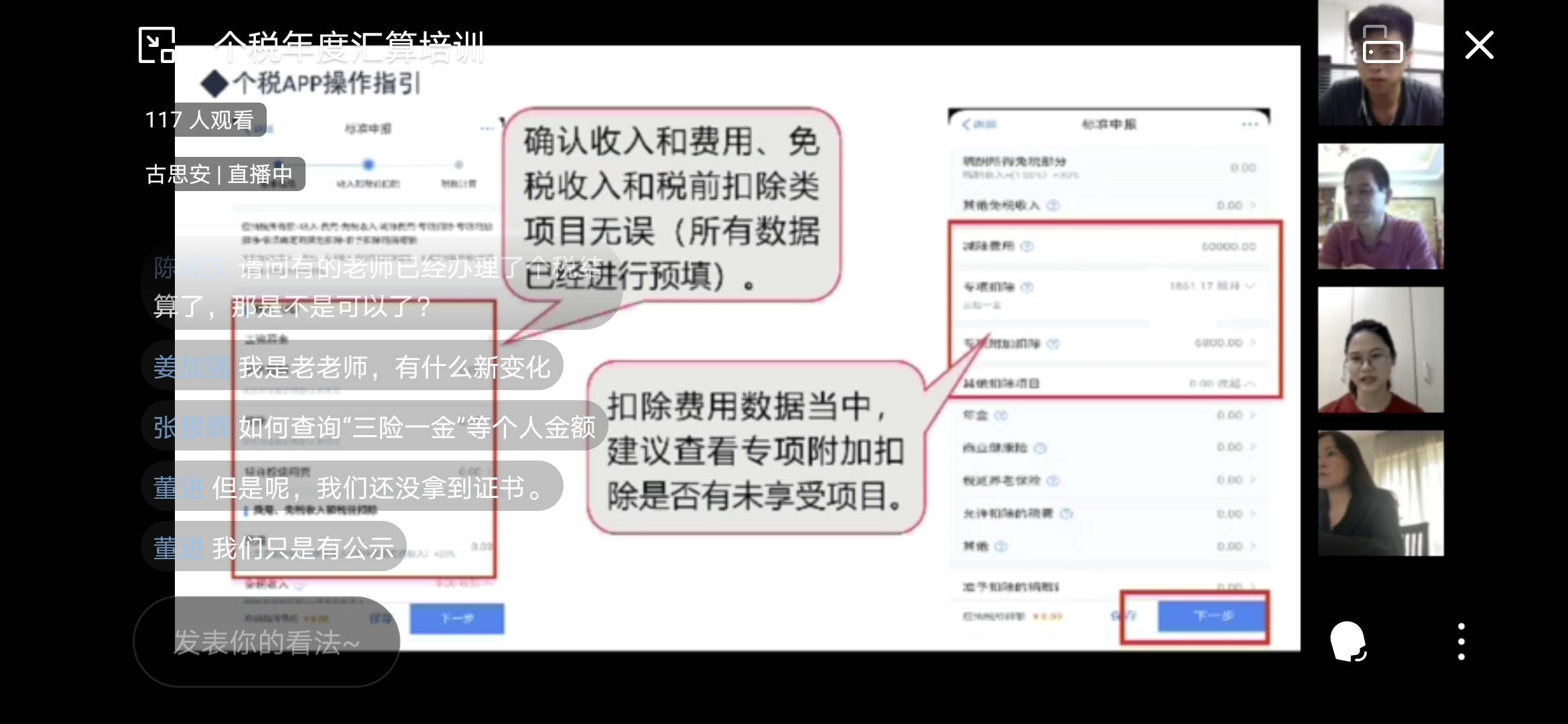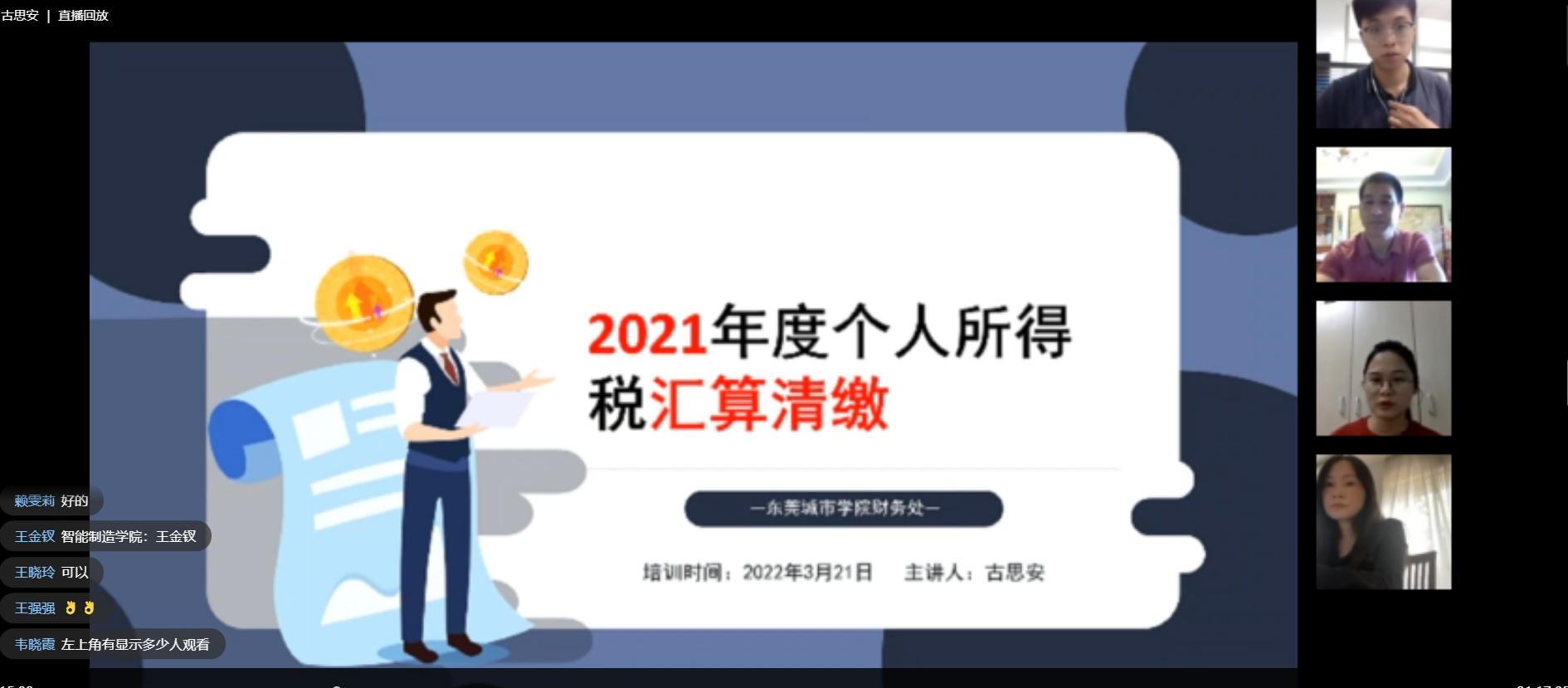 财务处古思安老师通过直播方式,对个人所得税APP软件的实操和汇算清缴的热点难点问题进行讲解。内容涵盖了年度汇算的内容、办理时间、办理途径、缴纳税款与退税的操作流程、如何办理汇算的要求,以及汇算清缴的流程等内容做了详细的讲解,并对与会人员的提问进行了详细解答。
