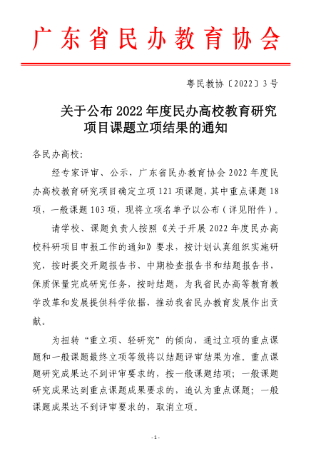 近日,广东省民办教育协会公布了2022年民办高校教育研究课题立项结果,beat365官网史雍真《民办高校党建与“立德树人”深度融合机制研究》,姜海波《广东民办本科院校应用型人才质量保障体系构建》,叶云峰《独立学院转设后品牌建设策略研究——以beat365官方网站为例》获批立项。