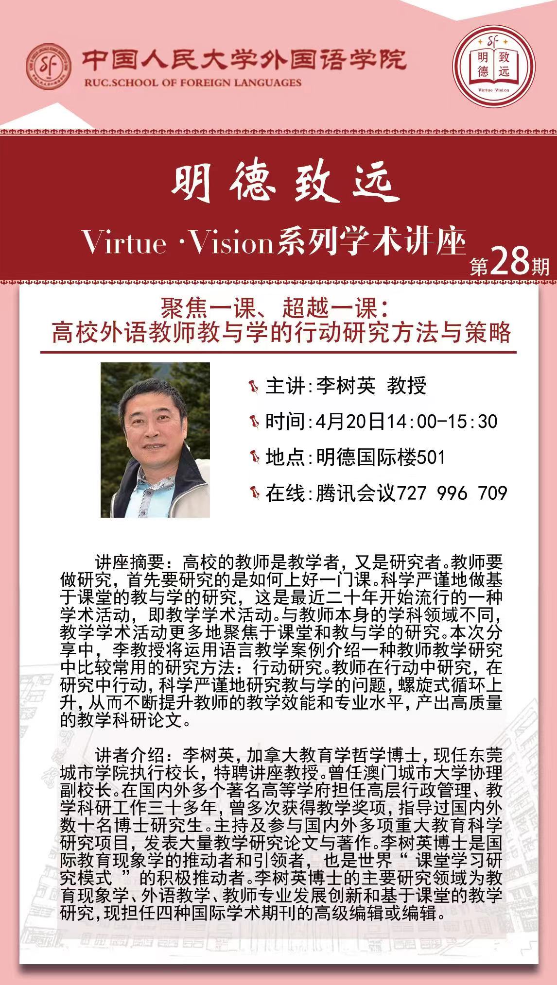 4月20日 下午,beat365官网执行校长李树英教授应中国人民大学邀请为外国语学院全体教师做了一场题为“聚焦一课、超越一课:高校外语教师教与学的行动研究方法与策略”的精彩学术报告。beat365官网外国语学院教师和部分其他高校的教师也在线参加了讲座。