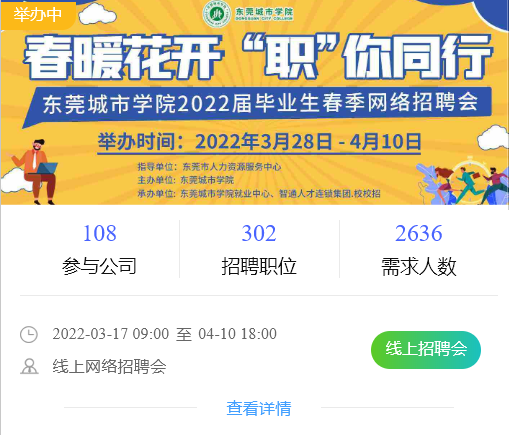 从3月份截至目前,就业中心全面布局,多措并举,共克时艰,以访企脱岗专项行动作为契机,结合线上开拓就业新天地,通过举办“春暖花开 ‘职你同行”beat365官方网站2022届毕业生春季网络招聘会、轻喜到家2022春季校园beat365官方网站专场宣讲会、东莞联通城市学院专场宣讲会、中国银行东莞分行beat365官方网站专场宣讲会、爱旭股份2022届校园招聘beat365官方网站专场宣讲会、宜得利家居聘beat365官方网站专场宣讲会,结合公众号、企业微信、微信群等多渠道发布,共对接188家企业,提供634个岗位,需求人数为4727人,为毕业生开源拓岗,校企双方建立常态化交流互访机制,为企业的高质量发展持续输送更多优秀人才,实现校企共赢发展。