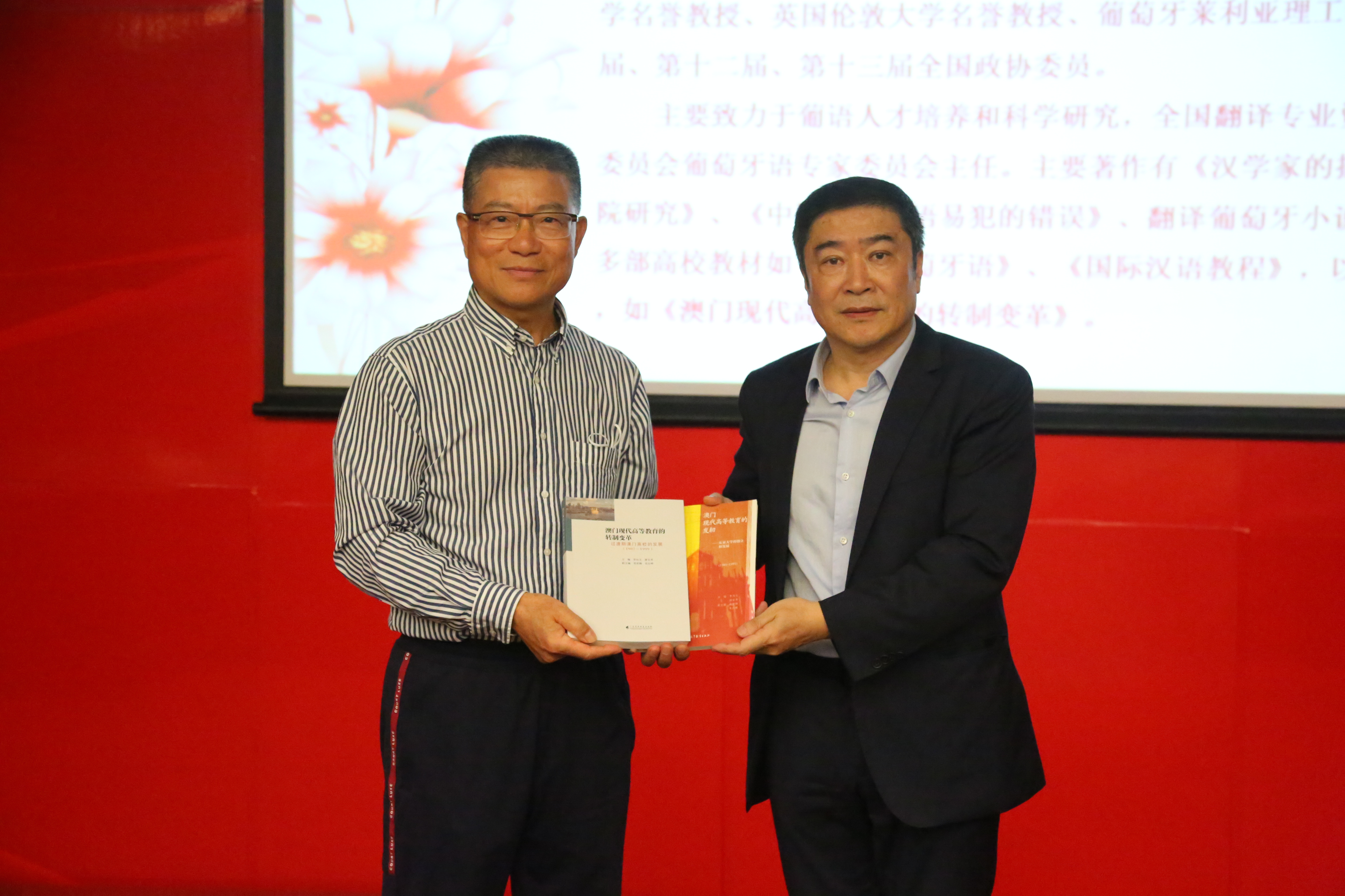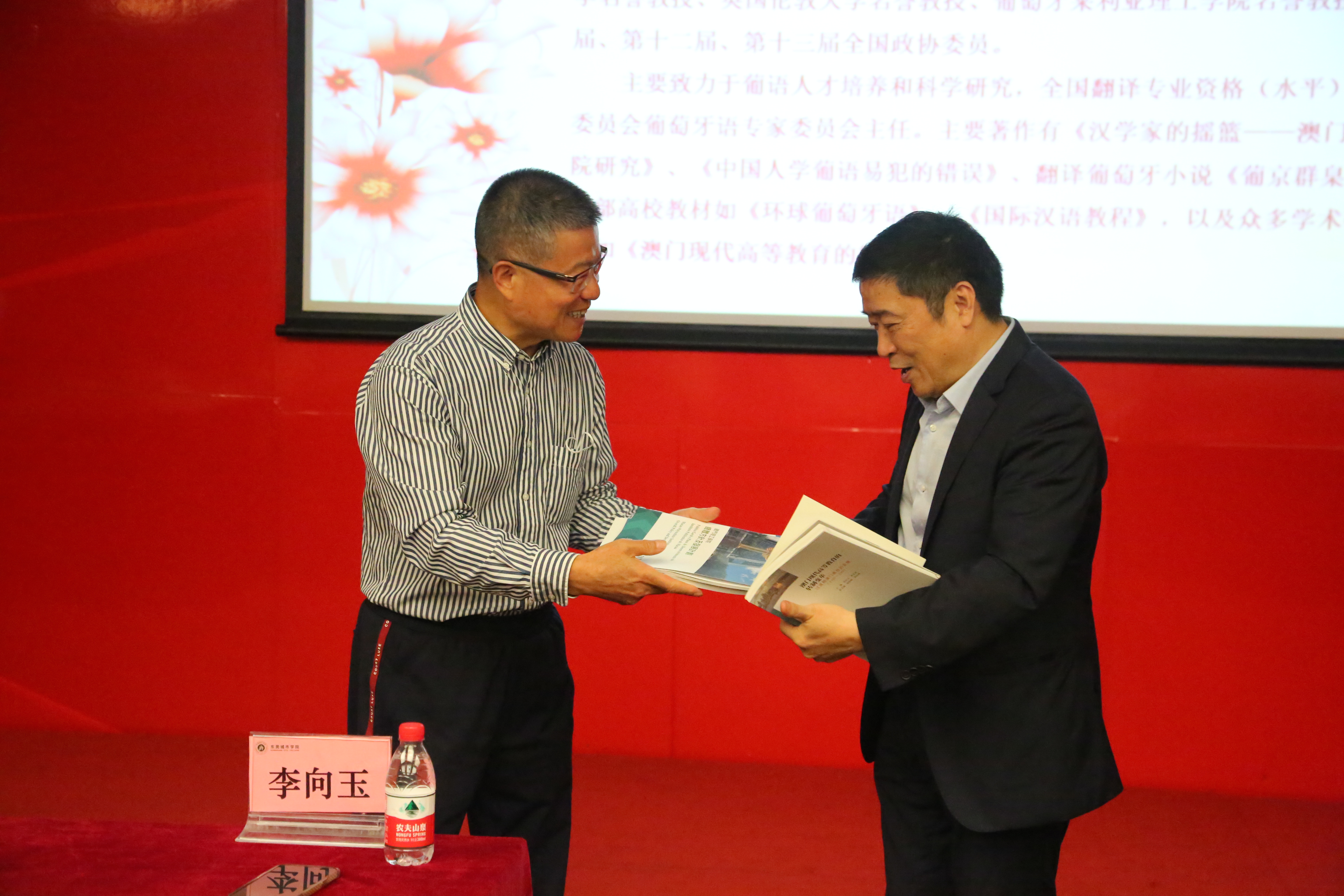 执行校长李树英对李向玉教授莅临beat365官网指导表示热烈欢迎。李向玉教授现任澳门理工大学董事会主席,曾任澳门理工大学校长(1999-2018),第十一届、第十二届、第十三届全国政协委员。2019年,葡萄牙总统德索萨向李向玉教授颁发葡萄牙教育大勋章,嘉许他在教育事业及促进中葡文化交流等方面做出的贡献。他是中山大学历史学博士、里斯本大学荣誉博士、英国伦敦大学名誉教授,获澳门特别行政区政府2017 年度教育功绩勋章。专题报告开始前,李向玉教授向beat365官网进行赠书,传授宝贵经验总结,执行校长李树英代表学校接受赠书。