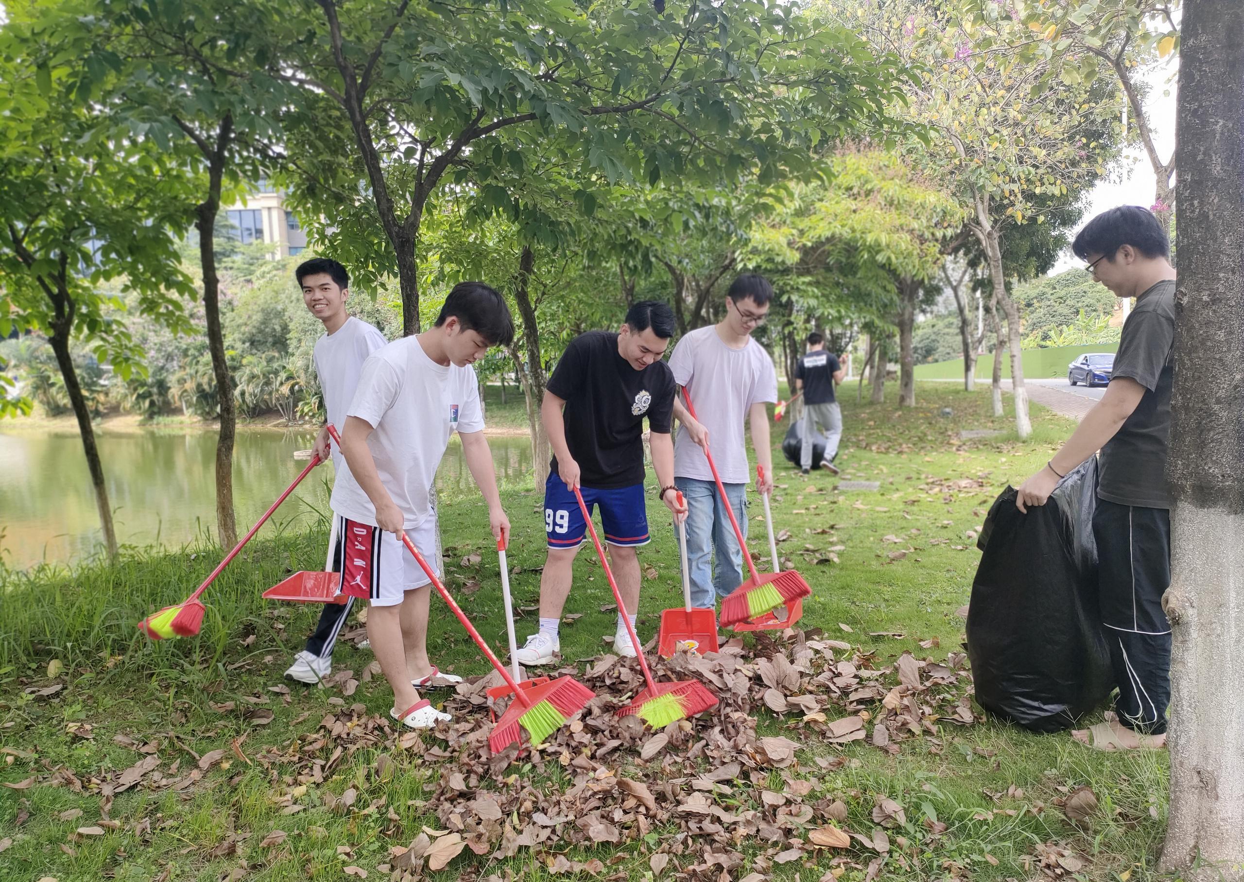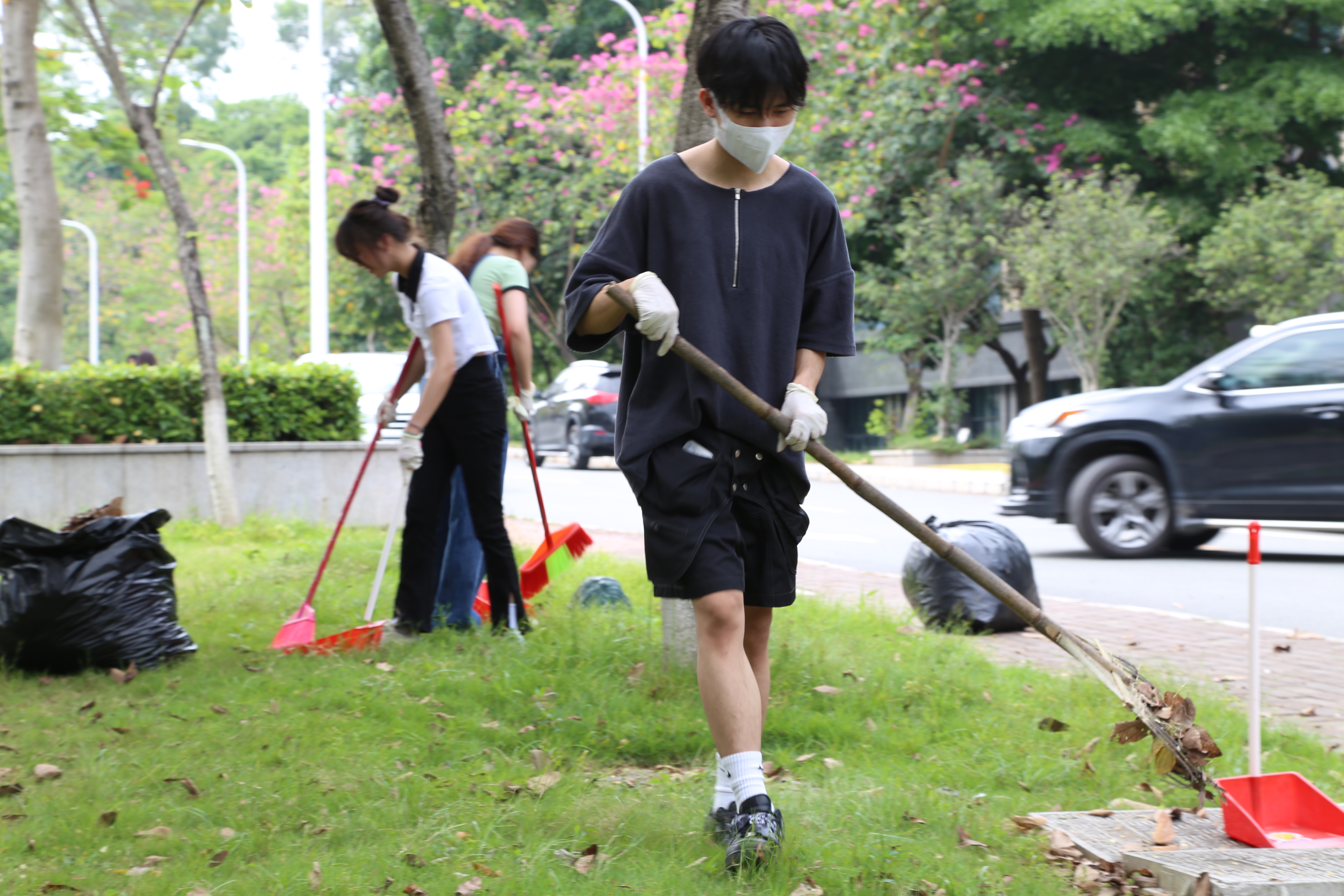 任课老师布置完劳动任务后,各小组快速奔赴自己负责区域进行校园卫生清洁服务,扫落叶、除杂草、捡垃圾,分工明确,相互合作,整个校园到处都是热火朝天的劳动景象。