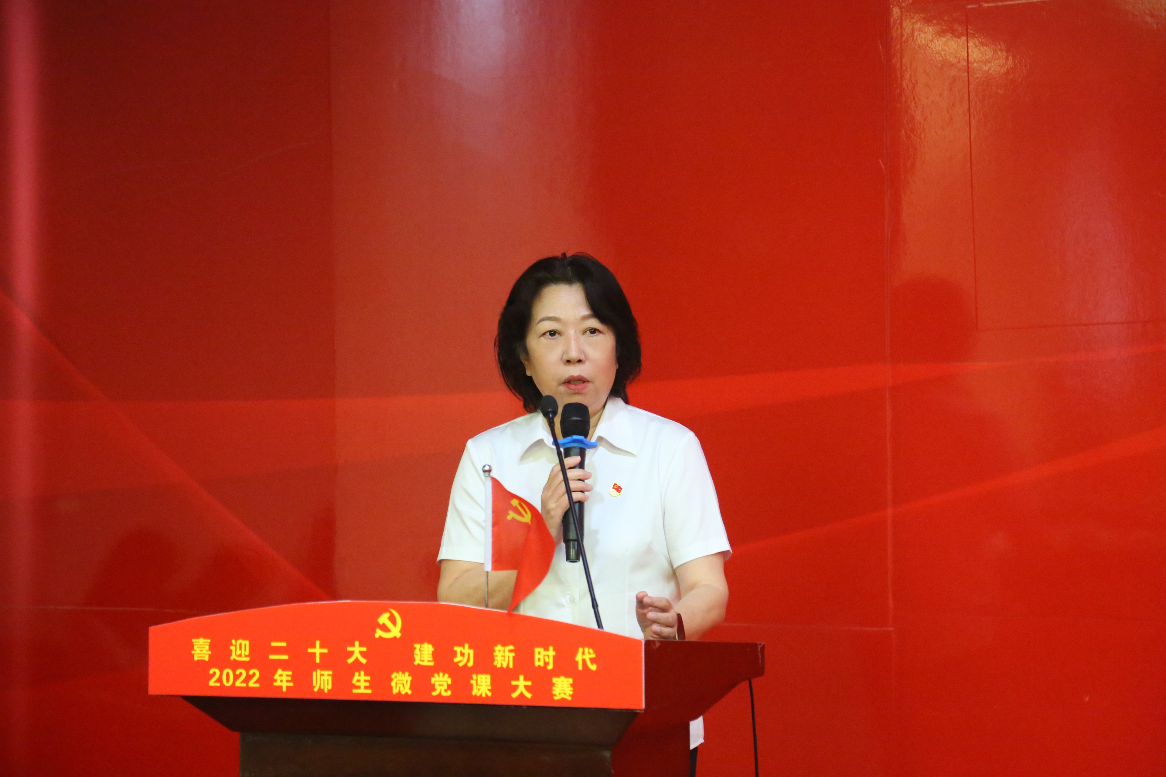 党委副书记刘玉侠进行了总结讲话,她指出,10位参赛选手围绕大赛主题,通过真实典型、鲜活生动的事例,结合自身的切实感受,讲述了党筚路蓝缕、以启山林的奋斗之旅,展现了蕴含在百年光辉征程中的精神力量,展示了新时代青年党员勇挑时代重任的担当作为,为迎接党的二十大营造了良好的氛围。希望通过本次微党课大赛,更加激发师生党员的活力,进一步坚定理想信念,带动全校师生党员知党史、感党恩、担使命,踔厉奋发,以实干实效迎接党的二十大胜利召开!