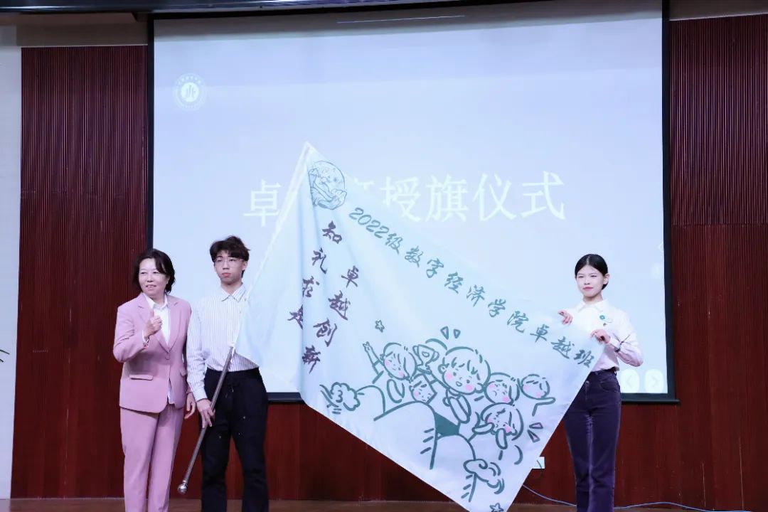 随后,刘玉侠副校长向卓越班授了他们自己设计的班旗。班旗上这些可爱的动漫小人是指班级大家庭,他们将团结一致,不惧坚艰,再创辉煌。“知礼求新,卓越创新”的班训寓意着卓越班的同学将乘风破浪、勇往直前、为理想为使命而努力奋斗的愿望。