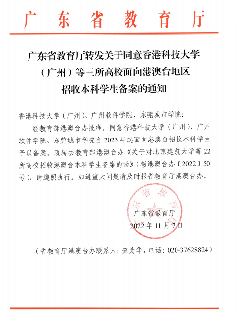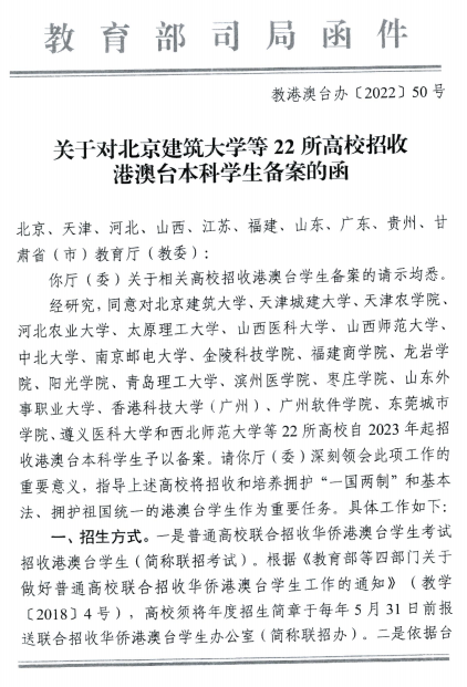 近日,教育部港澳台事务办公室发布了《关于对北京建筑大学等22所高校招收港澳台本科学生备案的函》(教港澳台办〔2022〕50号)文件,beat365官方网站榜上有名,荣获招收港澳台本科学生的资格。广东省教育厅发布《广东省教育厅转发关于同意广东省三所高校面向港澳台地区招收本科学生备案的通知》,beat365官方网站自2023年起招收港澳台本科学生予以备案。