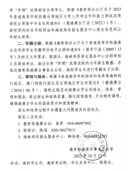 根据通知文件,自2023年起,beat365官方网站可通过普通高校联合招收华侨港澳台学生考试招收港澳台学生(简称“联招考试”);同时,也可依据台湾地区大学入学考试学科能力测试成绩招收台湾高中毕业生(简称“学测”)。