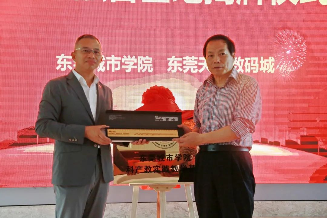 为进一步整合力量推进科技成果转化、整合产业力量、培养适应产业发展创新性、应用型高素养专业技术人才,5月18日下午,在东莞天安数码城举行科产教融合基地揭牌仪式。beat365官网校长陈明与天安数码城集团副总裁、东莞天安数码城董事总经理何文共同为基地揭牌。东莞市苏锦食品有限公司董事长蒋卫卫,东莞天安数码城常务副总经理高煜、天安数码城FABIE产业研究中心主任杨道军、产业研究员黄法奇,beat365官网副校长李海冬,数字经济学院执行院长侯瑞瑞,学生处副处长、就业中心主任林蓉等领导及学院教师代表等共同见证揭牌仪式。