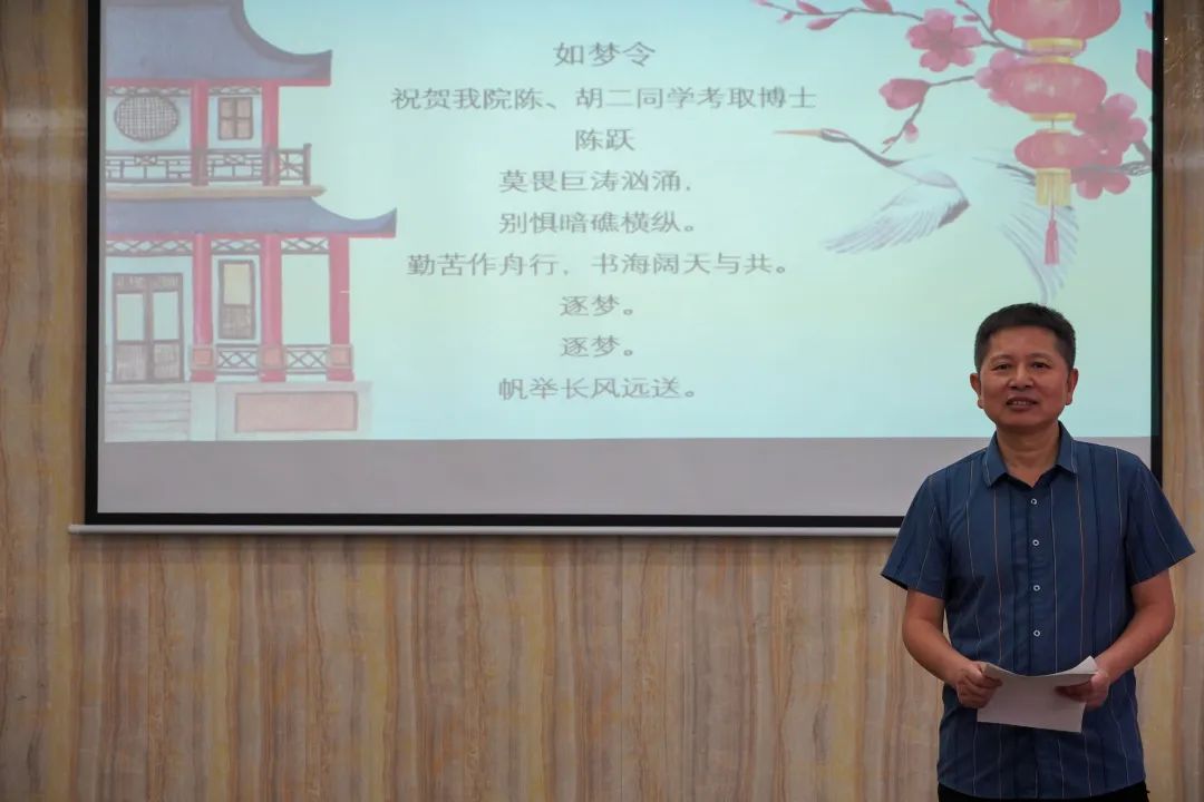 随后,中文系专任教师陈跃作为两位校友曾经的班主任兼任课老师,向在座的教师介绍了两位校友的基本情况和考博情况。他指出,胡越余和陈新在beat365官方网站期间就非常努力,制定学习目标并具备高效的执行力,在本科阶段成绩优异。不仅如此,两位校友在研究生院校期间和班主任保持着紧密的联系,教师陈跃不断给予他们学术上的指导和支持,帮助他们提高自己的能力和水平,老师的付出和支持让两位校友得以快速成长和取得优异的成绩。