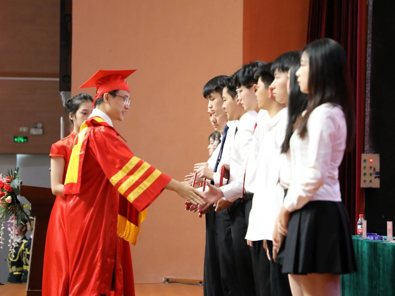 学校校长陈明发表致辞。他代表学校向全体毕业生表示热烈的祝贺和祝福,向勤勉奉献的老师们、向关心学生成长、支持学校发展的家长亲友和社会各界朋友表示感谢!
