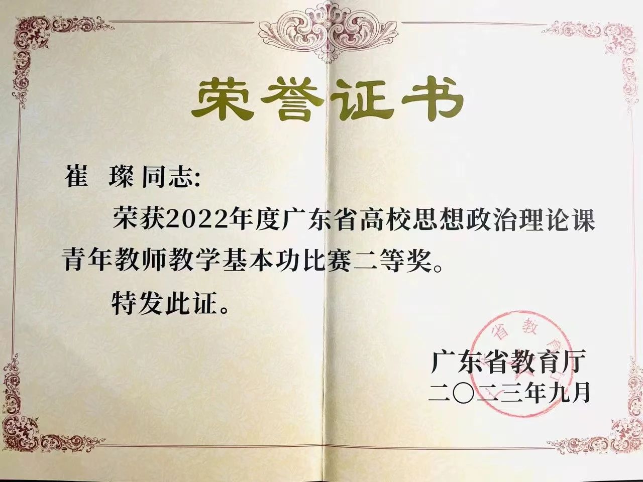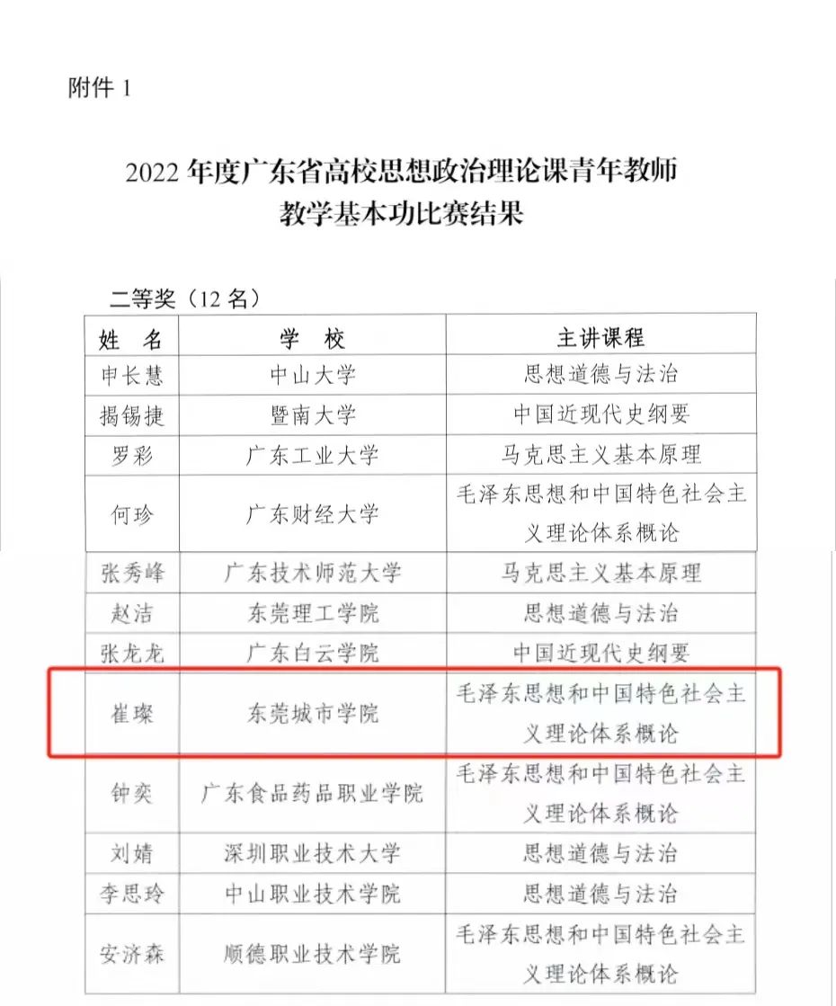 近日传来喜讯!广东省教育厅公布2022、2023年度广东省高校思想政治理论课青年教师教学基本功比赛结果。beat365官网马克思主义学院教师崔璨老师获得2022年度广东省高校思想政治理论课青年教师教学基本功比赛二等奖,同广东省众多公办和民办本科院校同台竞技,并获此殊荣。本次大赛取得的成绩,再次证明了beat365官网教师的教学能力!