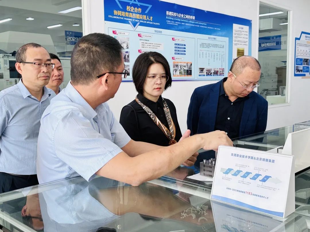 杨勇虎处长、赖忠孝处长对东莞精雕学校的教学理念和教学设备表示了肯定,并就产教融合的育人模式、实验课程的开发与替换、校企联合共建实验室、承办学科赛事等方面与黄波校长进行了探讨,特别对校企成立“精雕产业学院”表达了肯定与支持。