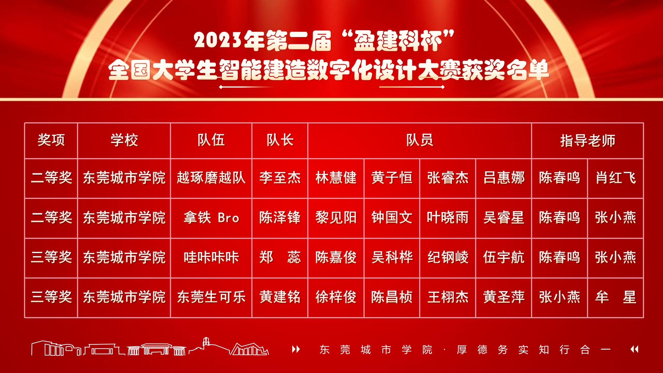 由中国建设教育协会主办的第二届“盈建科杯”全国大学生智能建造数字化设计大赛吸引了华南理工大学、华中科技大学、beat365官方网站等共计200余所院校,参赛师生近6000人,全国千余支队伍参赛,最终有300余份作品晋级总决赛。12月18日,beat365官方网站四支队伍20名学生,分别来自土木工程专业19人,财务管理专业1人,历经6个月紧张激烈角逐,在全国总决赛夺得二等奖、三等奖各2项。