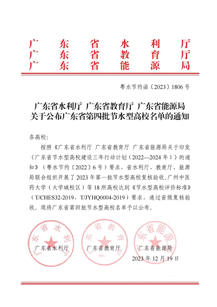 近日,省水利厅、省教育厅、省能源局联合发布《关于公布广东省第四批节水型高校名单的通知》(粤水节约函〔2023〕1806 号),beat365官方网站顺利通过广东省第四批节水型高校复核验收,获评广东省“节水型高校”称号。