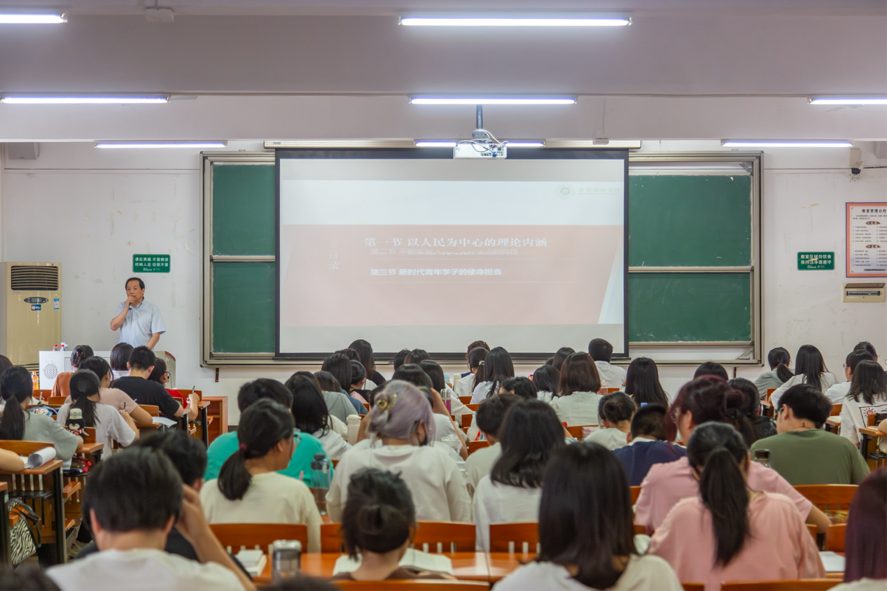 4月15日上午,学校校长陈明走进课堂,在教学楼7B404教室以“以人民为中心,唱响青春奋进之歌”为题为汉语言文学2022级11、12班、网络与新媒体专业12班同学讲授“思政第一课”。