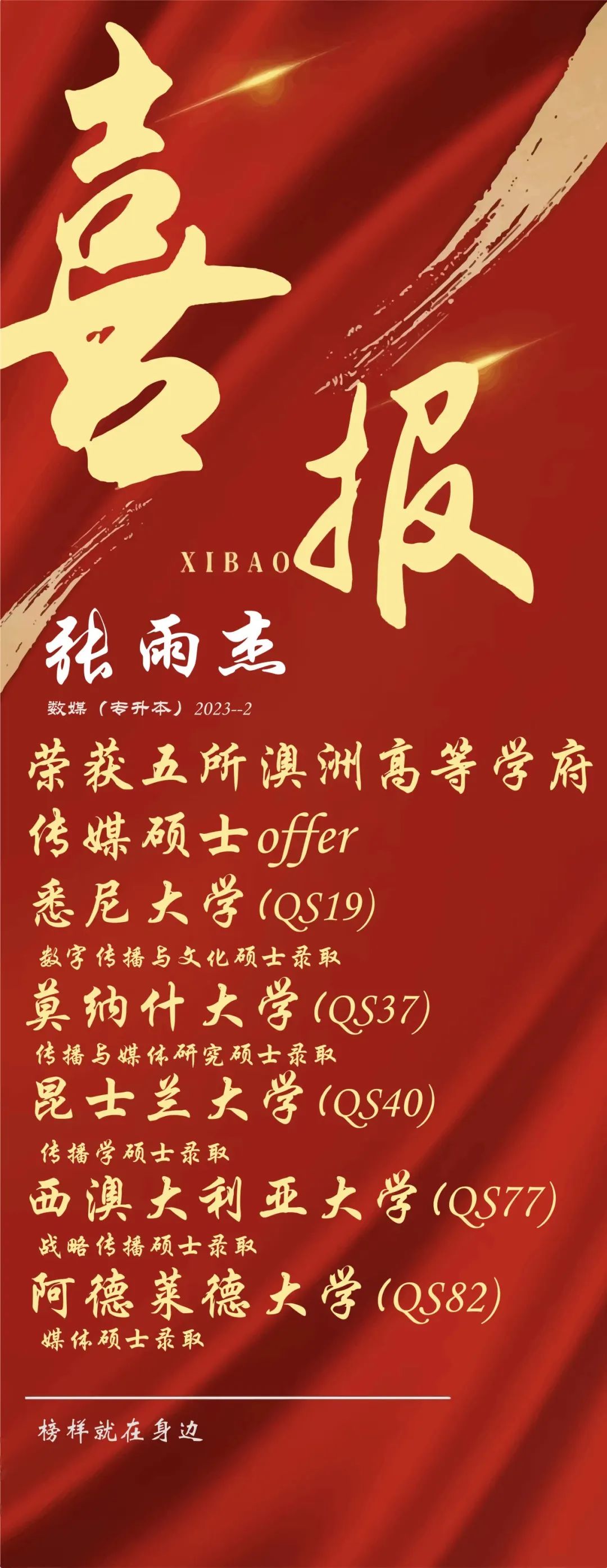 近期,创意设计学院张雨杰同学传来喜讯,他成功斩获澳大利亚五大名校Offer,向着梦想的舞台大步迈进,开启学术新征途。