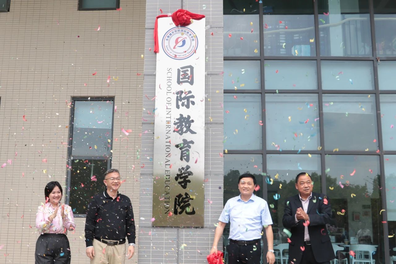 各位领导以及师生代表在国际教育学院的牌匾旁合影留念。