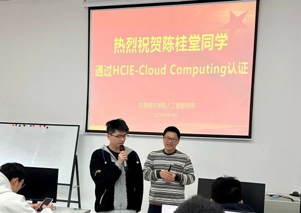 2025年319日上午,在人工智能学院软工专升本20241班的实验课堂上,发生了一幕特别的颁奖仪式。执行院长、任课教师张伟明利用上课前的时间,为成功获得华为HCIE-Cloud Computing认证的学生陈桂堂颁发了纪念品,这一小小的仪式不仅激励了全班同学,也为他们提供了宝贵的学业与职业规划教育。